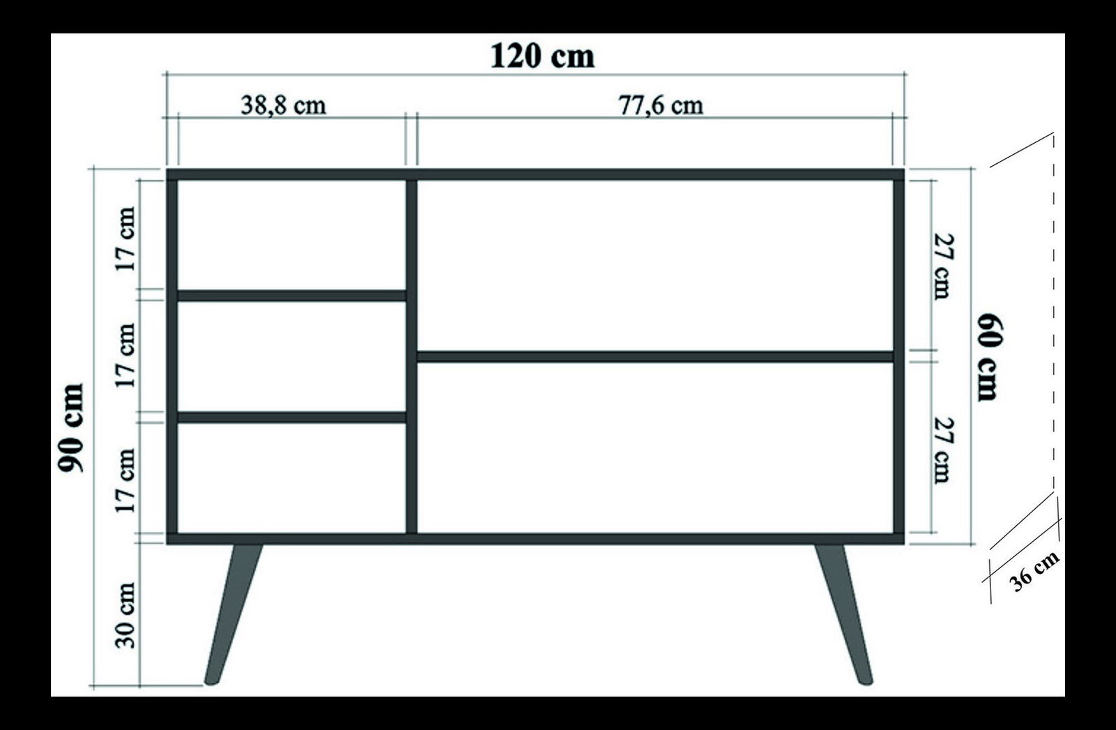 debljina: 18 mm, drvene noge, metalne ručke, uv premaz, širina: 120 cm, visina: 90 cm, dubina: 36 cm, dimenzije desne police: širina: 77,6 cm, visina: 27 cm,dimenzije lijeve police: širina: 38 8 cm, visina: 17 cm, visina nogu: 30 cm
