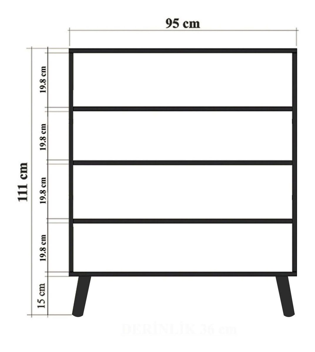 debljina: 18 mm, drvene noge širina: 95 cm, visina: 111 cm, dubina: 36 cm, visina nogu: 15 cm, visina police: 19,8 cm