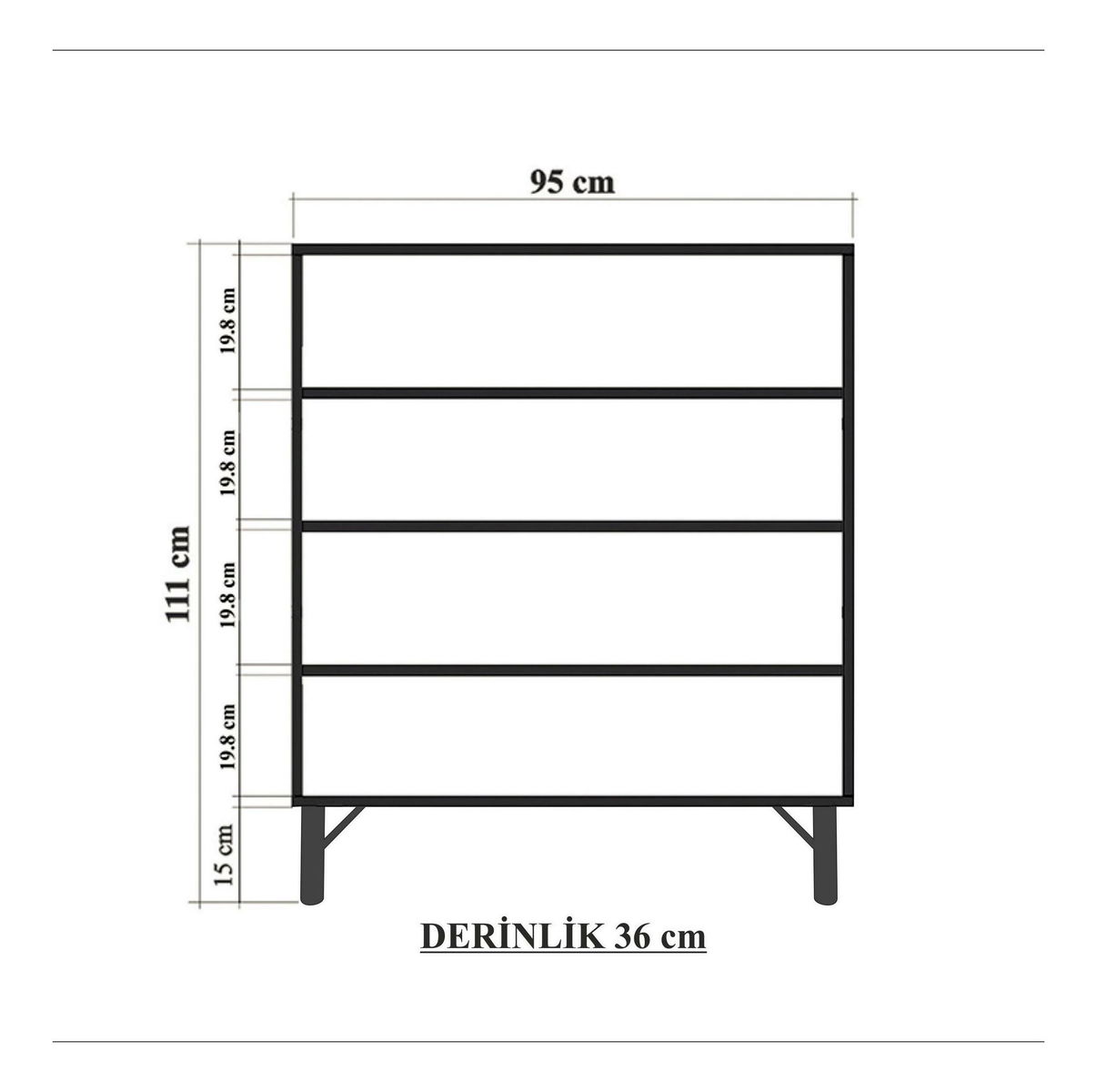 debljina: 18 mm, metalne noge, širina: 95 cm, visina: 111 cm, dubina: 36 cm, visina nogu: 15 cm, visina police: 19,8 cm