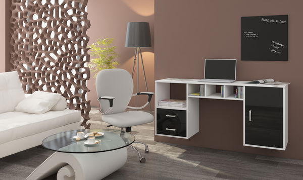 Praktičan PC stolić Hanger modernog dizajna. S desne strane se nalazi ormarić, a s lijeve su dvije ladice i prostor za odlaganje knjiga ili dokumenata. Dolazi u bijeloj boji u kombinaciji s crnim sjajem.