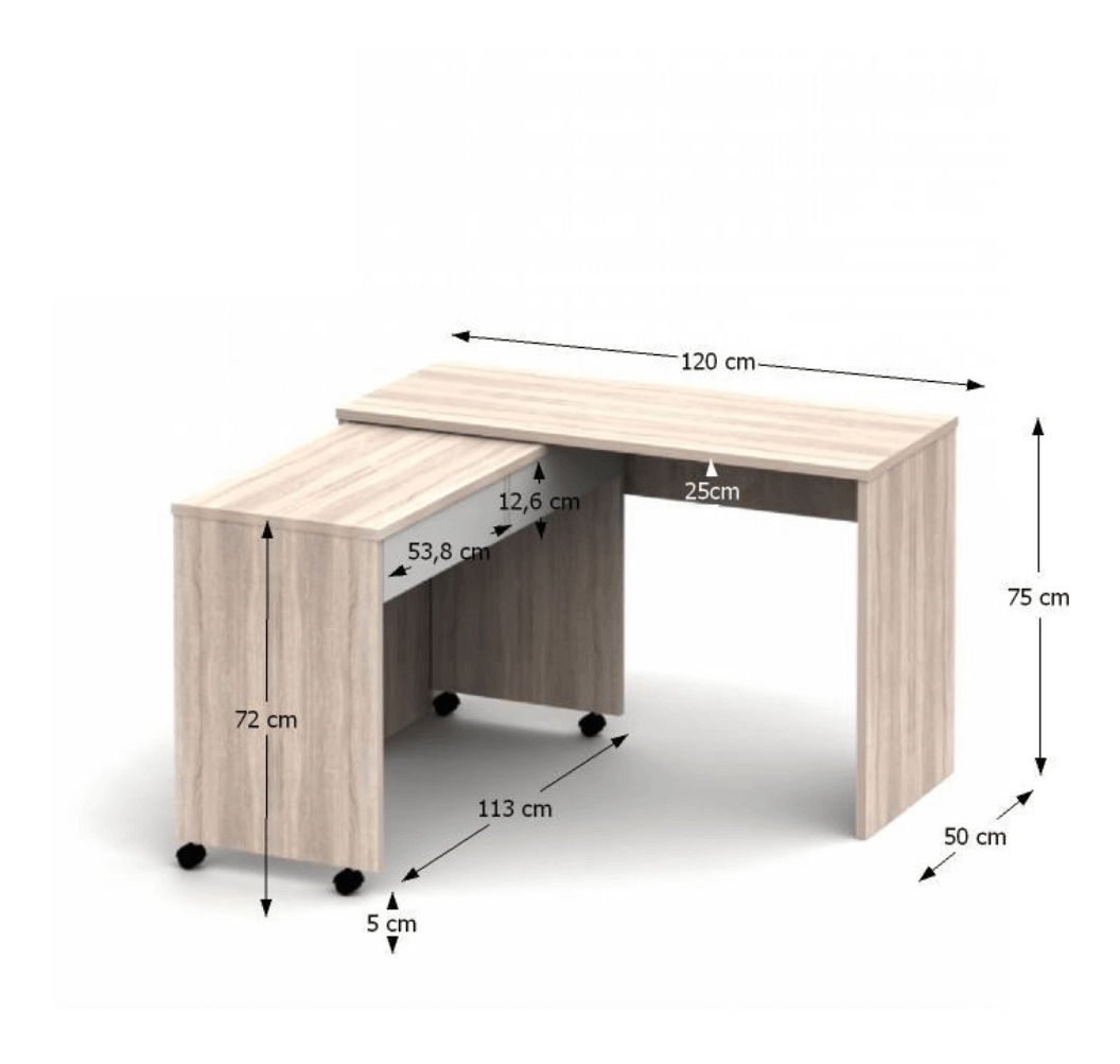 PC stolić Versal može se razvući i pružiti dovoljno radnog prostora. Kombinacija boja: hrast sonoma svijetla + bijela