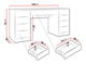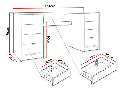 PrikazPisaći stol je idealan izbor za one koji traže udobnost i stil. Upoznajte model koji će funkcionirati u mnogim zadacima. Moderni pisaći stol Razimo Bis pružit će prostor za knjige i predmete koji se koriste za rad i učenje. Može se koristiti i kao funkcionalna beauty zona. U pratnji ogledala postaje idealna baza za svakodnevnu njegu. Pisaći stol s ladicama odličan je način da organizirate prostor. Prostrani spremnici olakšavaju održavanje reda. Cijeli pisaći stol upotpunjen je urezima na frontama ladica i zlatnim ručkama. Dimenzije: širina: 154 cm, visina: 76 cm, dubina: 55 cm. Izvedba: korpus: laminirana ploča debljine 16 mm, fronte: MDF ploča debljine 16 mm, ABS i melaminski rub, kugličaste vodilice, zlatne aluminijske ručke, noge: crni klizači, ogledalo nije uključeno. Jamstvo: 24 mjeseca.