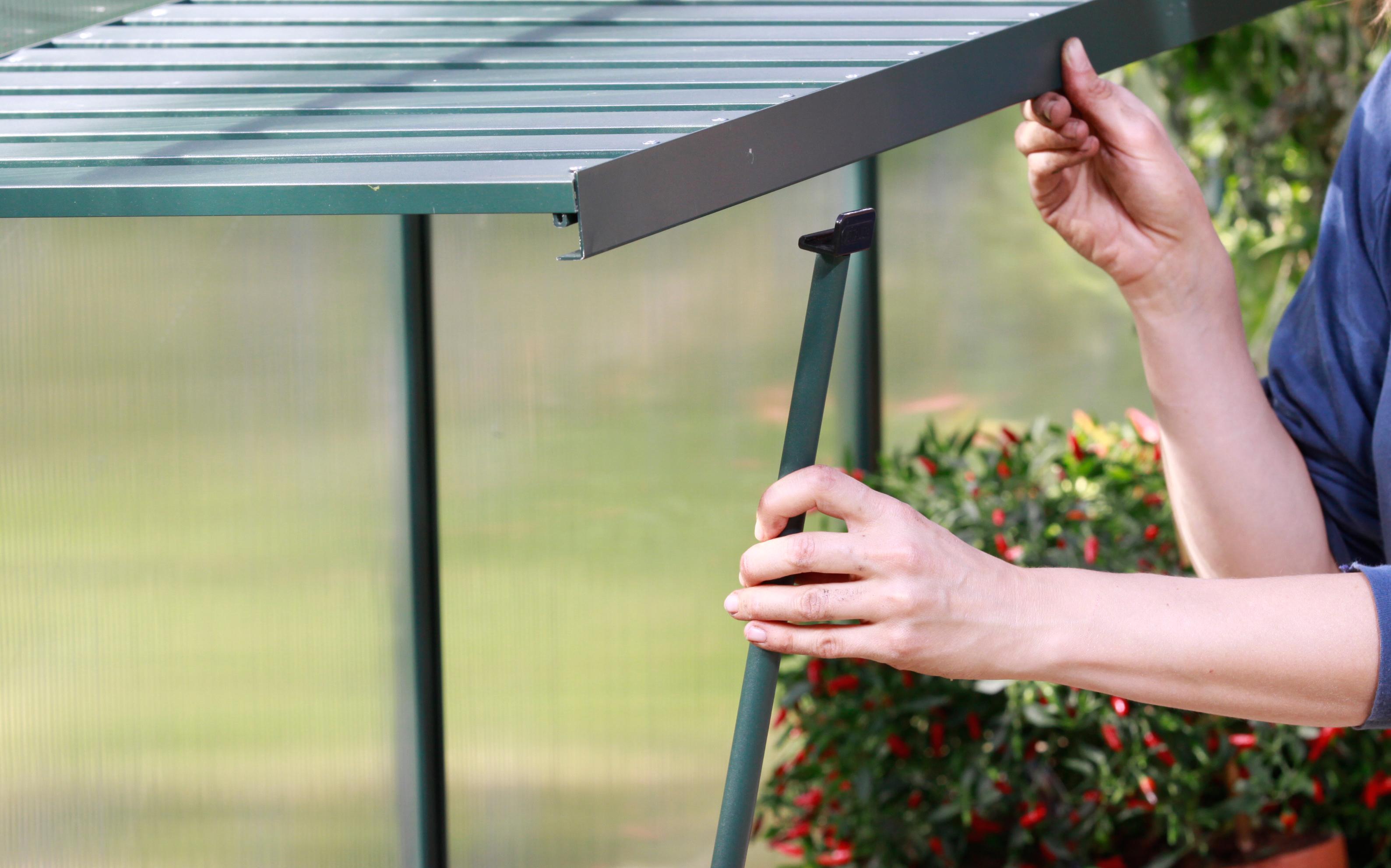Sklopive police pružaju veću fleksibilnost i optimiziraju prostor u stakleniku. Na primjer, tijekom sezone vrtlarenja možete postaviti visoke biljke na policu ili dobiti više radnog prostora.