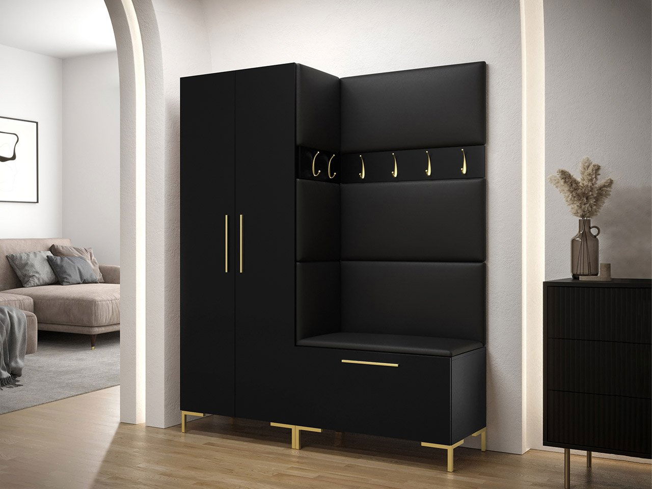 plastika u zlatnoj boji (bijeli i crni namještaj) ili crnoj boji (namještaj u boji hrast craft),ravne šarke,vješalice sadrže 6 kuka,Izvedba tapeciranih panela.