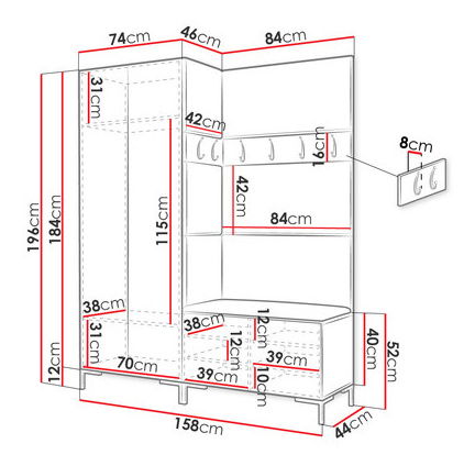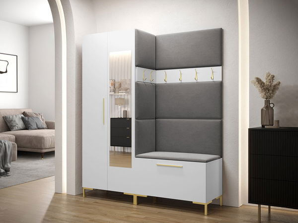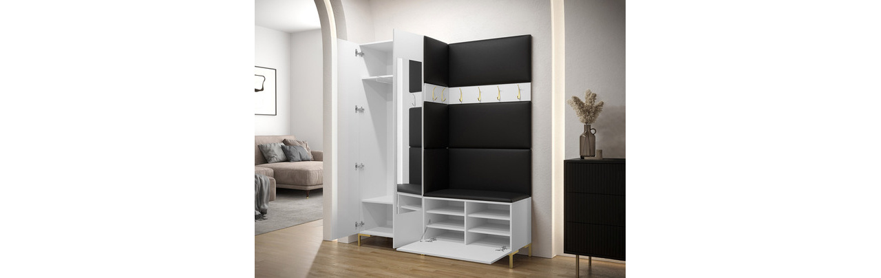 Set za predsoblje je idealan izbor za one koji traže udobnost i stil. Dimenzije: Ormar s ogledalom Frunoft: širina: 74 cm, visina: 196 cm, dubina: 46 cm, ormarić za obuću Frunofta: širina: 84 cm, visina: 52 cm, dubina: 46 cm, Frunofta vješalica za odjeću 84: širina: 84 cm, visina: 16 cm, Frunofta vješalica za odjeću 41: širina: 41 cm, visina: 16 cm, tapecirani panel Pag 42x42: x3 širina: 42 cm, visina: 42 cm, dubina: 4 cm, tapecirani panel Pag 84x42: x4 širina: 84 cm, visina: 42 cm, dubina: 4 cm. Izvedba namještaja od tvrdog drva: 16 mm laminirana ploča, stražnja strana od HDF ploče, rubovi su obrađeni izdržljivim PVC furnirom debljine 0,5 mm otpornim na svakodnevnu uporabu, ručke i nogice: plastika u zlatnoj (bijeli i crni namještaj) ili crnoj boji (namještaj u boji hrast craft), ravne šarke, ogledalo na prednjoj strani, vješalice sadrže 6 kukica. Izvedba tapeciranog panela: podloga panela je 8 mm ploča + 3 cm pjena T18 + tkanina, oblik: kvadrat / pravokutnik, 3D efekt, štiti zidove od oštećenja, apsorbira zvuk, uporaba: za interijer, paneli idealni za završnu obradu zidova. Ormarići su univerzalni, pa ih je moguće montirati po želji – desno ili lijevo. Jamstvo: 24 mjeseca.