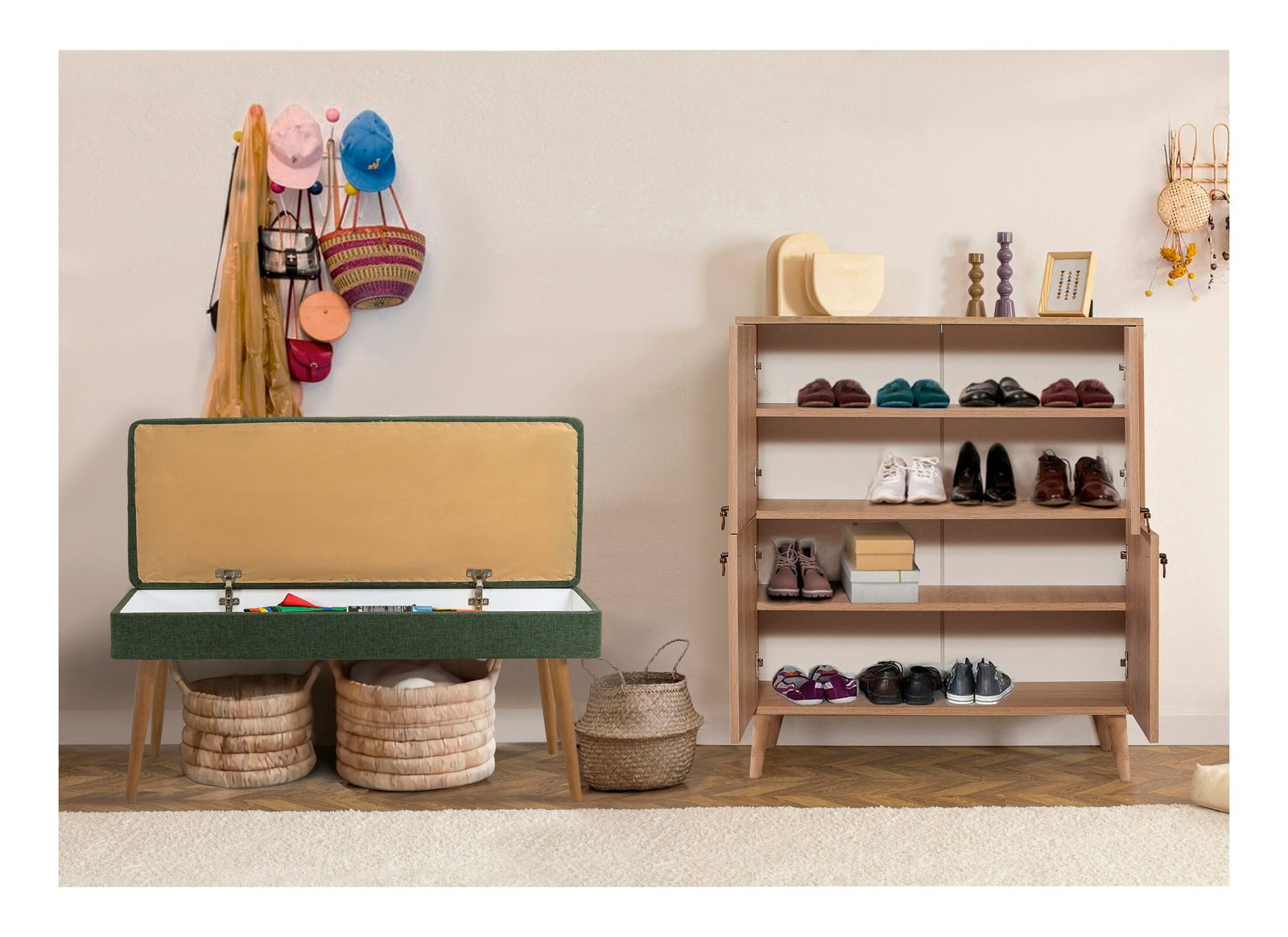 debljina: 18 mm, drvene noge, ormarić za obuću: širina: 95 cm, visina: 111 cm, dubina: 36 cm, (1 komad) dimenzije klupe: širina: 105 cm, visina: 49 cm, dubina: 40 cm