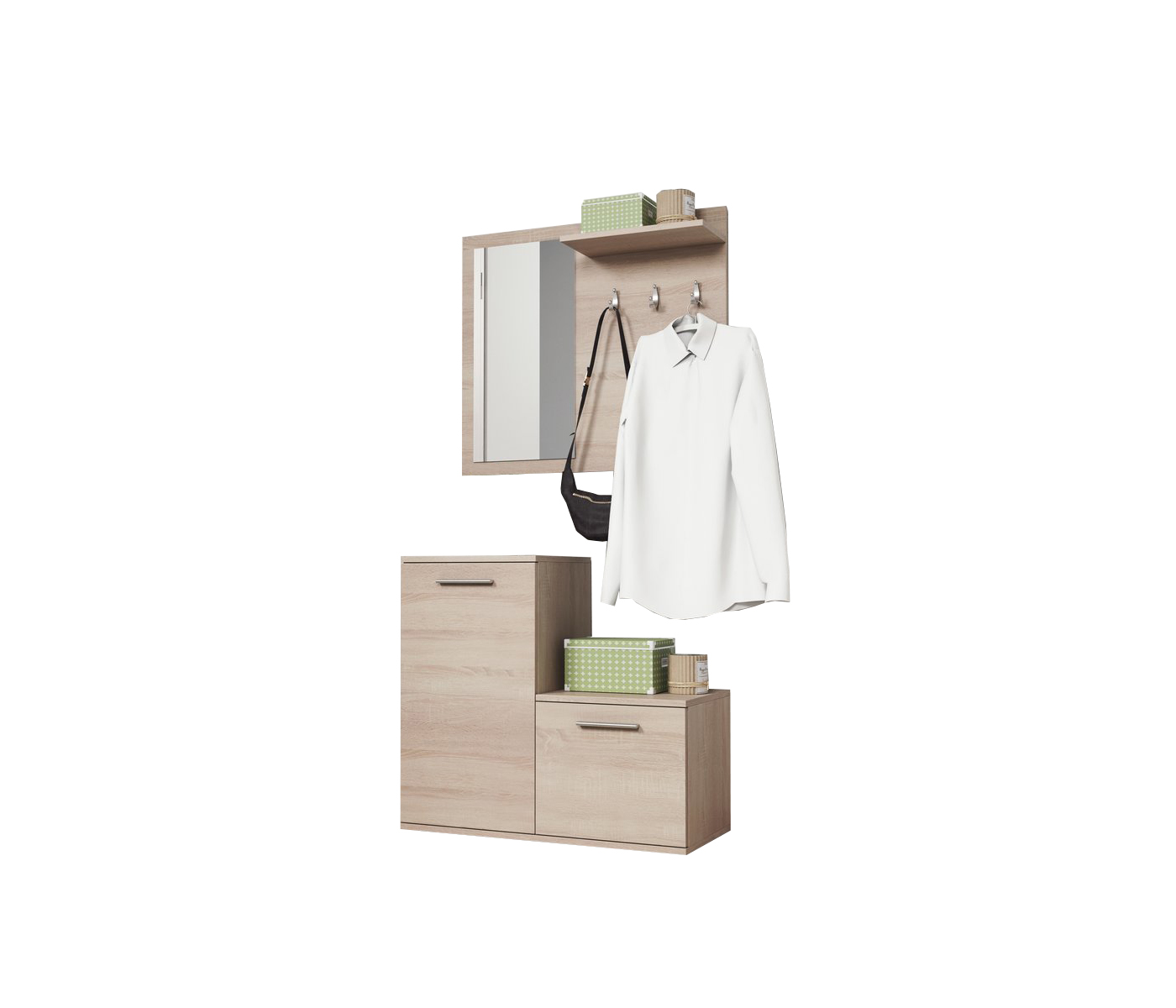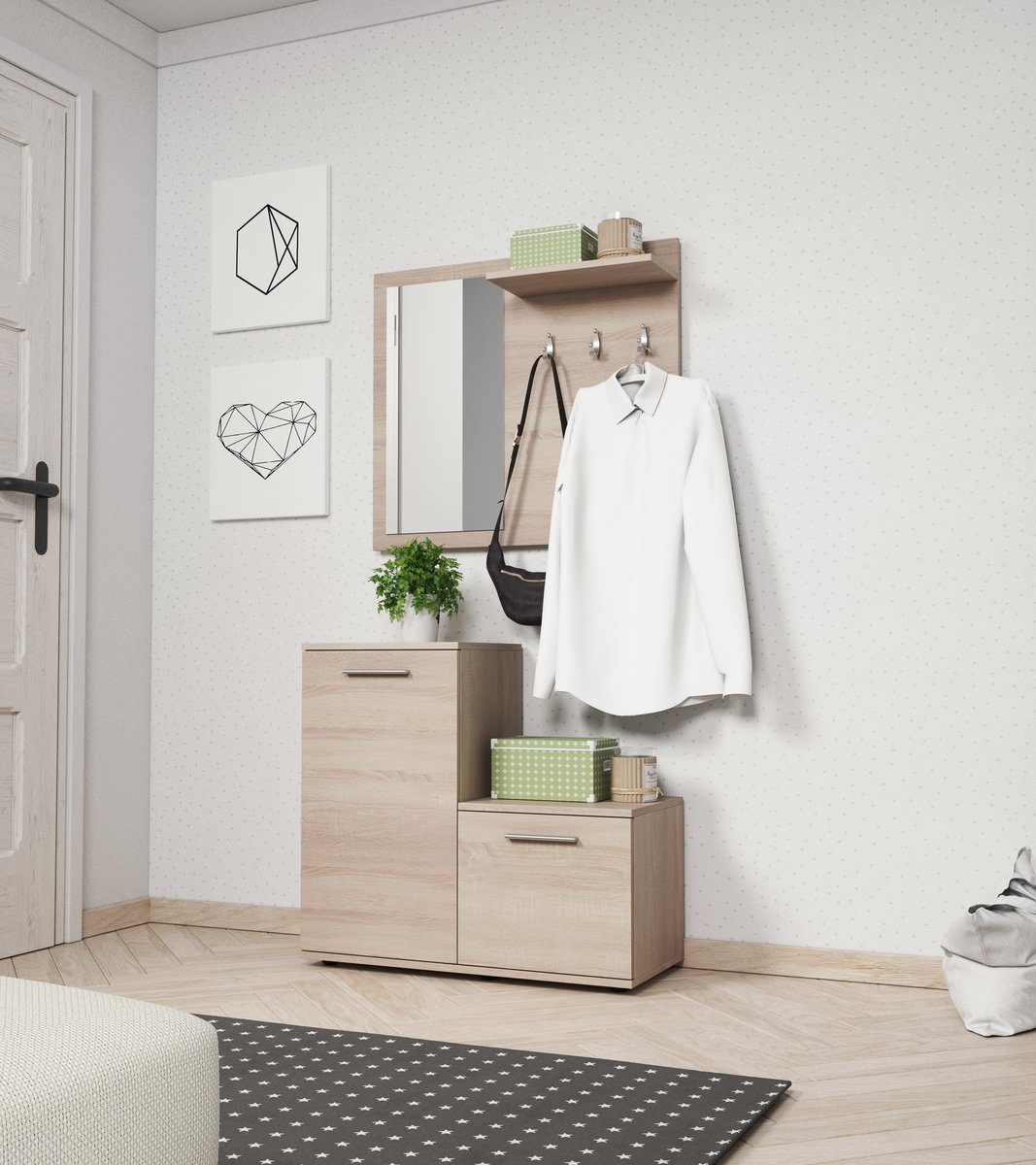 Moderno predsoblje Molly sastoji se od 2 donja ormarića koja služe kao ormarić za obuću, panela za vješanje odjeće s 3 kukice i policom za šešire i kape. Panel s ogledalom bit će vam pomoćnik u pripremanju za posao ili van.