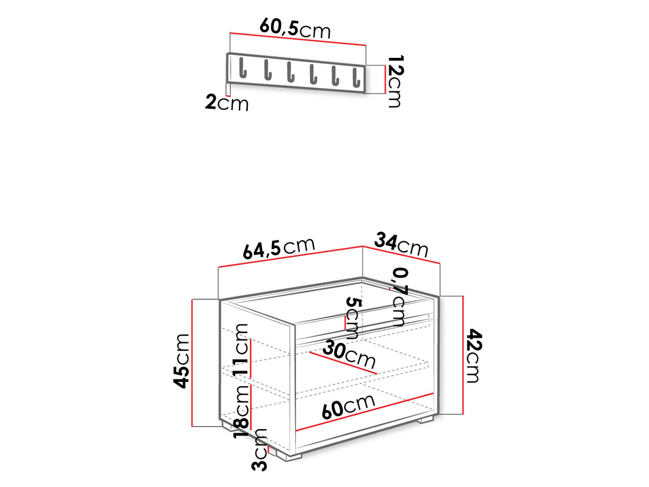 PrikazSet za predsoblje Konkor 60 + tapecirani zidni panel idealan je izbor za one koji traže udobnost i stil. Set Konkor omogućuje zanimljivo i praktično uređenje hodnika. Kombinacija ormarića za obuću s panelom na kojem se nalaze vješalice povećava funkcionalnost prostora. Kompaktan ormar ne zauzima puno mjesta, omogućuje udobno obuvanje i odlaganje jakni po povratku iz grada, posla ili s obiteljskog izleta. Gornji dio ormara prekriven je mekim tapeciranim panelom. Boje možete uskladiti s ostalim elementima dekora zahvaljujući pripremljenim opcijama. Dimenzije: Ormarić za obuću Konkor 60: širina: 64 cm, visina: 45 cm, dubina: 34 cm. Vješalica 60: širina: 60 cm, visina: 12 cm, dubina: 2 cm. Tapecirani panel Pag 60x30: širina: 60 cm, visina: 30 cm, dubina: 4 cm. Izvedba namještaja: iverica debljine 16 mm, obične šarke, bez ručki – otvaranje „straga“, srebrne plastične noge, gornji dio ormarića ima rub koji drži tapecirane panele (nije potrebno njihovo lijepljenje), vješalica sadrži 6 kukica. Izvedba panela: baza 8 mm + ploča, 3 cm pjena T18 + tkanina, oblik: pravokutnik, 3D efekt, štiti zidove od oštećenja, zvučno izolira, za interijer, idealni za završnu obradu zidova ili kao uzglavlje kreveta. Jamstvo: 24 mjeseca.