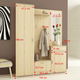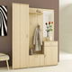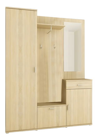 Lijep i praktičan set za predsoblje koji se sastoji od komode, garderobnog ormara, ormarića za obuću, panela za vješanje odjeće i ogledala. Garderobni ormar ima šipku za vješanje odjeće i policu.