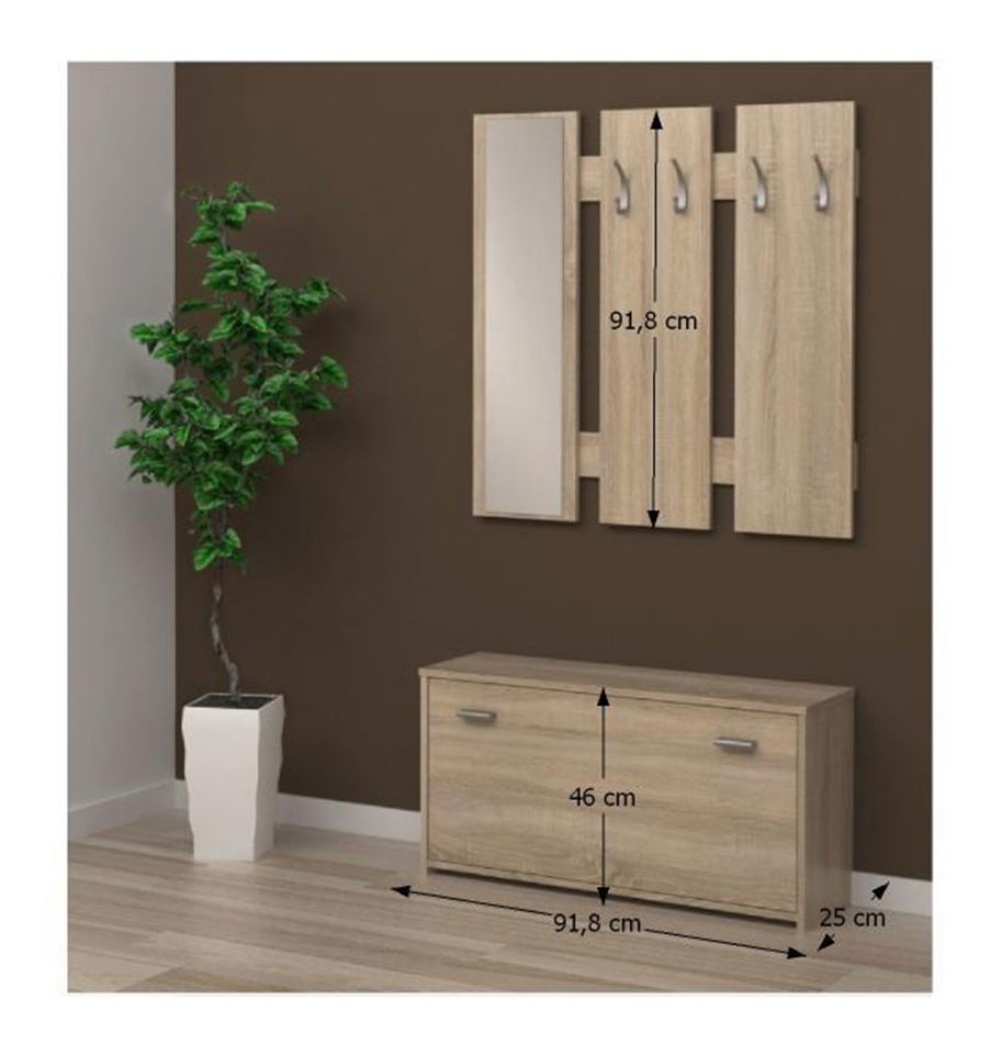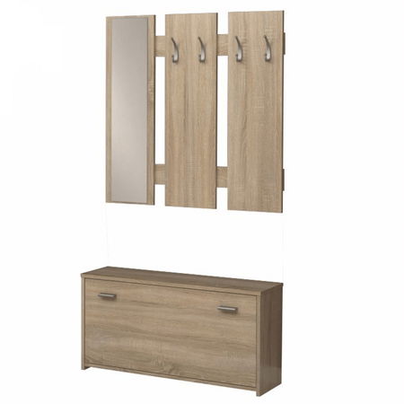 Set za predsoblje NEW uključuje ormarić za obuću, vješalicu za kapute i ogledalo. Izrada od laminirane ploče od iverice debljine 16 cm u boji hrast sonoma