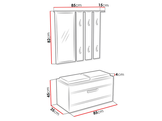 iveral laminiran 16 mm, PVC kant traka, sadrži 6 vješalica (kukica) za vješanje odjeće – visinu određujete sami, u ormarić za cipele stane 8-9 pari cipela, ne uključuje pribor za pričvršćivanje na zid