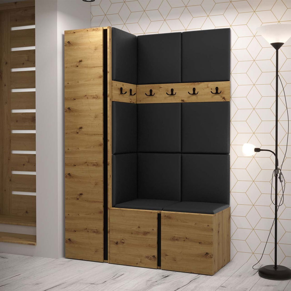 Predsoblje Timothy IX (hrast artisan + hrast artisan + crna) (ekokoža Soft 011 (crna))
