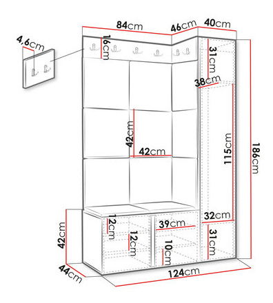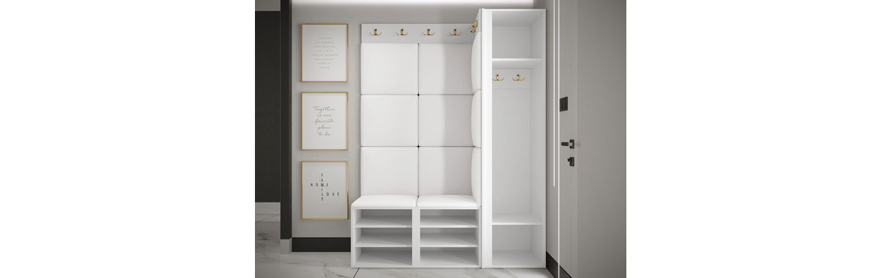 Set za predsoblje je idealan izbor za one koji traže udobnost i stil. Towiro Slim IX savršena je opcija za modernu predsoblje sa sjedalom. Odlično će se uklopiti u glamour i loft aranžmane. Set uključuje poluormar, ormarić za obuću, vješalice za odjeću i elegantan tapecirani panel dostupan u više boja, koji interijeru daje jedinstvenu atmosferu. Za estetski dojam ormara zaslužni su profinjeni ukrasni rezovi i zlatni detalji u obliku kukica i ručkica. Unatoč manjoj veličini, nudi mnogo pretinaca i polica za obuću i gornju odjeću, a dodatni prostor poslužit će i za stvari gostiju. Dimenzije: ormarić za obuću 2D: širina: 84 cm, visina: 42 cm, dubina: 46 cm, poluormar 1D: širina: 40 cm, visina: 186 cm, dubina: 46 cm, vješalica 42: širina: 42 cm, visina: 16 cm, dubina: 4,6 cm, vješalica 84: širina: 84 cm, visina: 16 cm, dubina: 4,6 cm, tapecirani panel Pag 42x42: x11, širina: 42 cm, visina: 42 cm, dubina: 4 cm. Izvedba namještaja: fronte – MDF ploča 16 mm + iverica 16 mm, korpus – iverica 16 mm, rubovi završeni PVC folijom 0,5 mm, zlatne metalne ručkice, plastične noge u boji korpusa, standardne šarke, vješalice sadrže 8 dvostrukih kukica. Izvedba panela: baza – ploča 8 mm + pjena T18 debljine 3 cm + tkanina, oblik: kvadratni, 3D efekt, štiti zid od oštećenja, zvučno izolira, montaža ljepilom, čičkom ili montažnom pjenom (nije uključeno u set), unutarnja upotreba. Jamstvo: 24 mjeseca.
