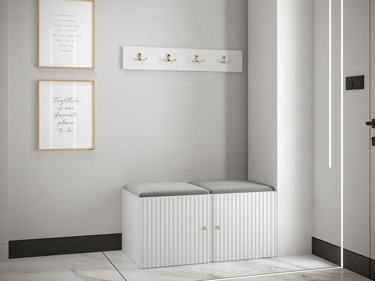 Set za predsoblje je idealan izbor za one koji traže udobnost i stil. Moderna garnitura za malo predsoblje Towiro Slim VI naglašava stilski izgled ulaza u kuću. Minimalistički izgled predsoblja sa sjedalom prekidaju frezirana čela. Moderan detalj čine simetrični utori na vratima ormarića. Zajedno s malim ručkama odgovorni su za suzdržanu eleganciju cijele garniture. Stil ovdje upotpunjuju tapecirani paneli koji obrubljuju gornji dio ormarića. Mekani jastuk koji nastaje njihovom ugradnjom olakšava obuvanje prije izlaska i nakon povratka kući. Funkcionalnost ormara povećava i panel s vješalicama. Praktične kukice stvaraju prostor za vješanje kaputa i jakni. Dimenzije: ormarić za cipele 2D: širina: 84 cm, visina: 42 cm, dubina: 46 cm. Vješalica za odjeću 84: širina: 84 cm, visina: 16 cm, dubina: 4,6 cm. Tapecirani panel Pag 42x42: x2 širina: 42 cm, visina: 42 cm, dubina: 4 cm. Izvedba namještaja: prednja strana: MDF ploča debljine 16 mm + iverica debljine 16 mm, korpus: iverica debljine 16 mm, rubovi završeni 0,5 mm PVC furnirom, zlatne metalne ručke, plastične noge u boji korpusa, obične šarke, vješalice sadrže 4 dvostruke kukice. Izvedba tapeciranog panela: materijal: podloga panela je ploča debljine 8 mm + 3 cm pjena T18 + tkanina, oblik: kvadratni, 3D efekt, štiti zidove od oštećenja, zvučno izolira, način montaže: ljepilom, čičkom ili montažnom pjenom (nije uključeno u cijenu, kupac kupuje zasebno), primjena: unutarnja, paneli idealni za dovršavanje zida. Jamstvo: 24 mjeseca.