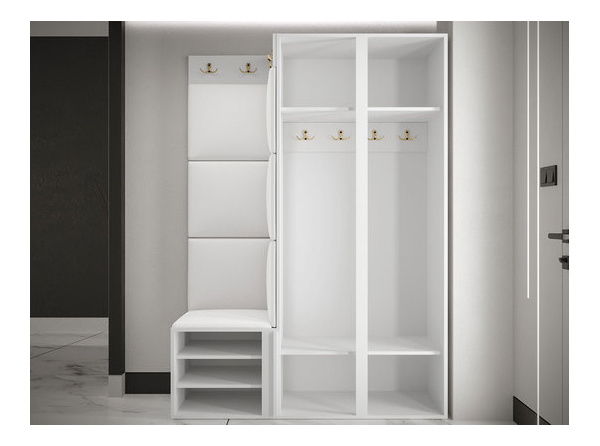 Set za predsoblje je idealan izbor za one koji traže udobnost i stil. Predsoblje Towiro Slim XXIII zanimljivo je rješenje posebno za veće prostorije. Model sadrži frontove s urezima, ormar za garderobu, vješalicu i tapecirane panele. Ova kombinacija je funkcionalno i elegantno rješenje koje će se savršeno uklopiti u svaki interijer. U prostoru koji nas dočekuje odmah pri ulasku u dom red je posebno važan. Ormar omogućuje odlaganje stvari, dok vješalica nudi praktično mjesto za kapute, jakne i druge komade odjeće i dodatke. Tapecirani paneli imaju dekorativnu funkciju, ali i štite zidove od oštećenja i prljavštine. Osim toga, mogu biti savršena dekoracija. Praktičan element ovog seta je i ormarić za obuću koji se može koristiti i kao sjedište. Ormar za garderobu pomaže u organizaciji prostora i daje predsoblju elegantan izgled. Savršeno rješenje za sve koji vole red i stil. Dimenzije: ormarić za obuću 1D – širina: 42 cm, visina: 42 cm, dubina: 46 cm. Vješalica x2 – širina: 42 cm, visina: 16 cm, dubina: 4,6 cm. Ormar 2D – širina: 74 cm, visina: 186 cm, dubina: 46 cm. Tapecirani panel Pag 42x42 x7 – širina: 42 cm, visina: 42 cm, dubina: 4 cm. Izvedba namještaja: front – MDF ploča 16 mm + iverica 16 mm, korpus: iverica 16 mm, rubovi završeni 0,5 mm PVC folijom, zlatne metalne ručke, plastične noge u boji tijela, standardne šarke, vješalice uključuju 8 dvostrukih kukica. Izvedba panela: podloga – ploča 8 mm + pjena T18 debljine 3 cm + tkanina, oblik: kvadratni, 3D efekt, štite zidove od oštećenja, zvučno izolirajući, način montaže: ljepilo, čičak ili montažna pjena (nije uključeno, kupac nabavlja samostalno), primjena: unutarnja, paneli idealni za završnu obradu zida. Jamstvo: 24 mjeseca.