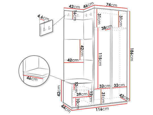 iverica debljine 16 mm,rubovi završeni PVC furnirom 0,5 mm,zlatne metalne ručke,plastične noge u boji tijela,obične šarke,vješalice sadrže 8 dvostrukih kuka.
