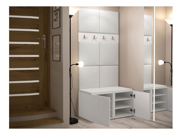 PrikazPredsoblje je idealan izbor za one koji traže udobnost i stil. Predsoblje Tavasz spaja dekorativne elemente i funkcionalnost. Namještaj se sastoji od tri različita elementa. Prvi je ormarić za obuću s nekoliko polica i udobnim sjedištem od tapeciranih panela. Tapecirani paneli razlikuju ormar Tavasz od drugih – oni nisu samo udobna potpora pri obuvanju, već i zanimljiv dekorativni element. Paneli su dostupni u modernim bojama koje naglašavaju karakter interijera. Posljednji element seta je ormar s četiri dvostruke vješalice. Ormari su univerzalni, pa se mogu montirati po želji – s lijeve ili desne strane. Ljepilo za panele nije uključeno. Dimenzije: Ormarić za cipele: širina: 84 cm, visina: 42 cm, dubina: 46 cm. Vješalica 84: širina: 84 cm, visina: 16 cm, dubina: 4,6 cm. Tapecirani panel Pag 42x42: x8, širina: 42 cm, visina: 42 cm, dubina: 4 cm. Izvedba: laminirana ploča debljine 16 mm, rubovi završeni izdržljivim PVC furnirom debljine 0,5 mm otpornim na svakodnevnu upotrebu, bez ručki, plastične noge, standardne šarke, vješalica s 4 dvostruke kuke. Izvedba tapeciranog panela: materijal: baza panela ploča debljine 8 mm + pjena T18 debljine 3 cm + tkanina, oblik: kvadrat, 3D efekt, štiti zidove od oštećenja, zvučno izolira, primjena: interijer. Jamstvo: 24 mjeseca.