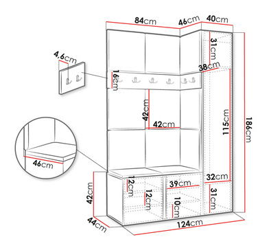Predsoblje je idealan izbor za one koji traže udobnost i stil. SET ZA PREDSOBLJE Tavasz X savršeno će upotpuniti prostor u svakom stanu. Njegova nesumnjiva prednost je ogledalo. Ovo rješenje čini ga još praktičnijim, jer osim spremišta pruža mogućnost da se pogledate prije izlaska iz kuće. Možete u njega pospremiti obuću, a obuvanje će biti posebno jednostavno zahvaljujući klupi s mekanim sjedištem. Boje fronti i tapeciranih panela su raznolike i prilagodljive većini projekata. Odsutnost ručki daje mu moderan karakter. To je komad namještaja koji vas dočekuje odmah na ulazu u dom. Vrijedi se pobrinuti da ormar u hodniku bude njegov reprezentativni element. Dimenzije: ormar sa zrcalom 40: širina: 40 cm, visina: 186 cm, dubina: 46 cm, ormarić za cipele: širina: 84 cm, visina: 42 cm, dubina: 46 cm, vješalica 84: širina: 84 cm, visina: 16 cm, dubina: 4,6 cm, vješalica 42: širina: 42 cm, visina: 16 cm, dubina: 4,6 cm, tapecirani panel Pag 42x42x11: širina: 42 cm, visina: 42 cm, dubina: 4 cm. Izvedba: korpus od laminirane ploče debljine 16 mm, rubovi obrađeni izdržljivom PVC trakom debljine 0,5 mm otpornom na svakodnevnu uporabu, bez ručki, plastične nogice, standardne šarke, ogledalo na prednjoj strani, vješalice sadrže 6 dvostrukih kuka. Izvedba tapeciranog panela: podloga od ploče debljine 8 mm + pjena T18 debljine 3 cm + tkanina, oblik: kvadratni, 3D efekt, štiti zidove od oštećenja, zvučno izolira, primjena: unutarnja, idealno rješenje za dovršavanje zidova. Ormarići su univerzalni pa ih je moguće montirati lijevo ili desno. Ljepilo za panele nije uključeno. Jamstvo: 24 mjeseca.