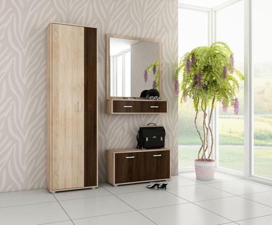 Komplet za predsoblje od 3 dijela, koji se mogu proizvoljno razmjestiti u prostoru ili držati skupa. Komoda ili stalak za cipele na slici u donjem desnom kutu ima jednu ladicu. Iznad nje na zidu je pričvršćeno ogledalo s debelim okvirom, koje na dnu ima 2 male ladice. Na slici s lijeve strane nalazi se visoki ormar s jednim vratima. Sklop stoji na malim sivim nogama i opremljen je kvadratnim sivim ručkama. Završna obrada je hrast sonoma tamni i hrast sonoma svijetli.