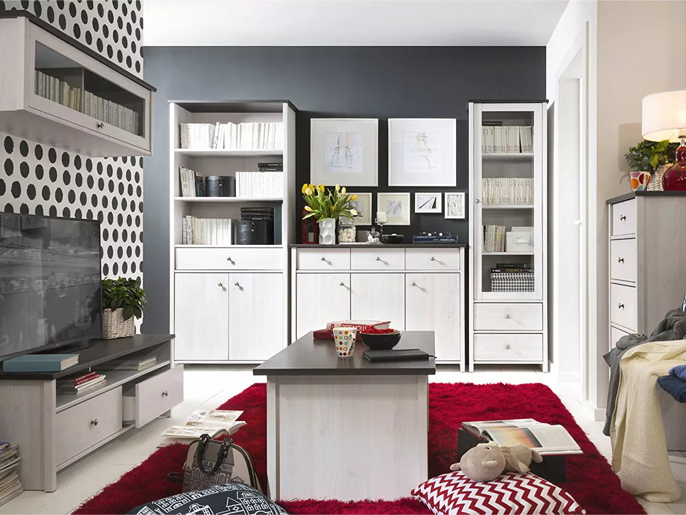 Ovdje možemo uklopiti ugodnu tapeciranu stolicu u svijetlim bojama, zaobljenog oblika, kao i visoko tapeciranu fotelju, nadopunjenu bojama usklađenim, elegantnim tabureom s drvenim nogama. Za maksimalno udobno sjedenje možete dodati nekoliko jastučića.