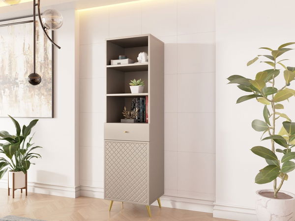 Regal je idealan izbor za one koji traže udobnost i stil. Regal Borunti 1D1SZ pomoći će vam urediti elegantan interijer. Savršeno će upotpuniti dnevni boravak ili spavaću sobu. Odlično će izgledati i u hodniku kao dekorativni element. Nudi tri prostrane police. Pustite mašti na volju i stvorite originalnu postavu. Sjajno rješenje je koristiti ga kao biblioteku. Kućna biblioteka san je svakog ljubitelja književnosti. Ovaj jedinstveni komad namještaja nudi i mnogo prostora za pohranu. Ladicu možete koristiti za razne dokumente, fascikle i druge sitnice. A da to nije sve, tu je i ormarić s dva pretinca za pohranu. Sigurno već znate što biste tamo pohranili! Dodatnog prostora za organizaciju nikad nije previše! Izuzetan izgled regala Borunti 1D1SZ ne smije se zaboraviti! Geometrijski dekor na prednjoj strani ormarića daje namještaju prestiž i karakter. Model će unijeti luksuz i eleganciju u vašu sobu. Nitko neće ostati ravnodušan! Dimenzije: širina: 50 cm, visina: 177 cm, dubina: 42 cm. Izvedba: korpus: laminirana ploča debljine 16 mm, fronte: MDF ploča debljine 16 mm, rubovi: ABS i melamin, kuglični ležajevi, ručke i noge: metal u zlatnoj boji, glatke fronte – otvaraju se pomoću ručki, frezirane fronte – sustav otvaranja "PUSH TO OPEN". Jamstvo: 24 mjeseca.