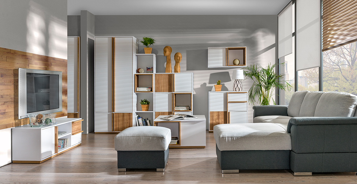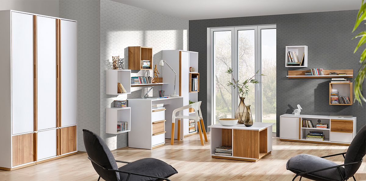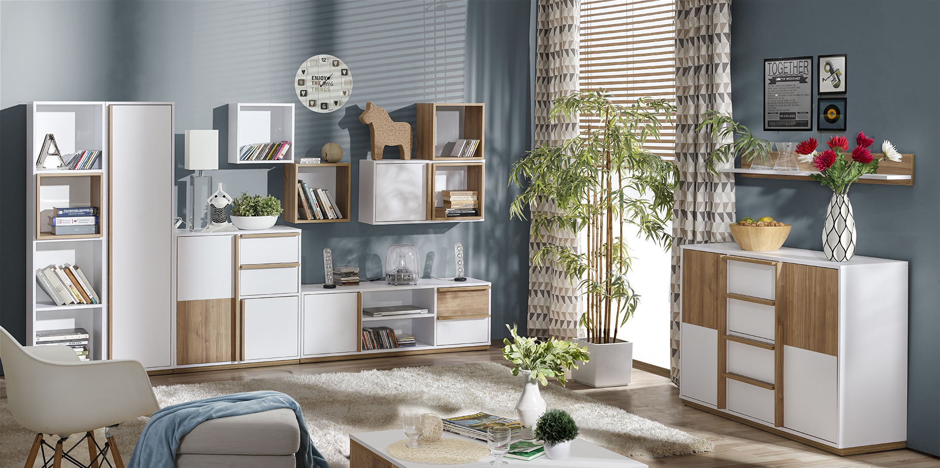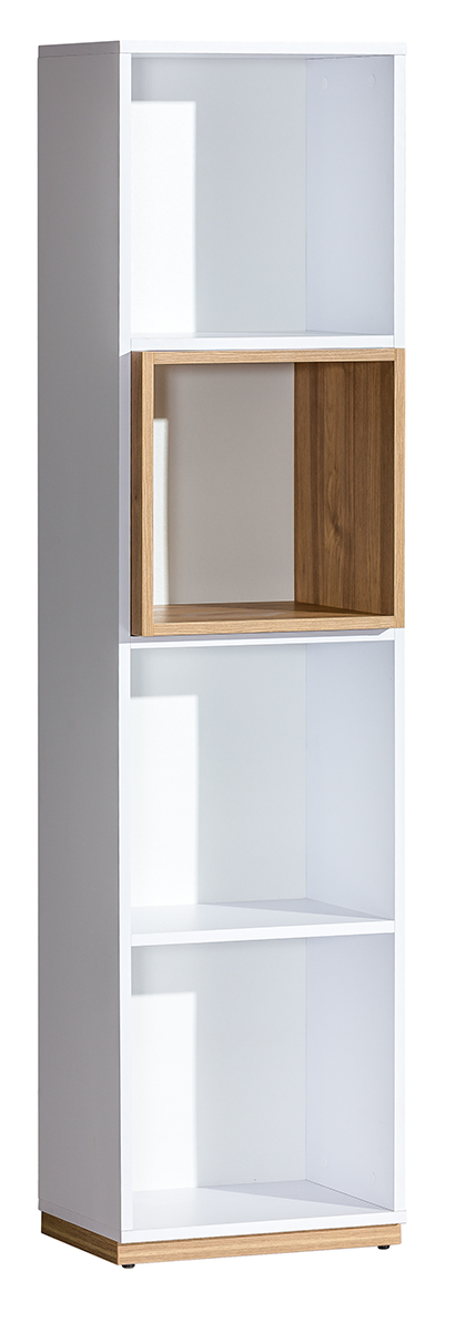 Uski regal Evanton neutralnih boja. Polica ima motiv drva oraha. Cijela linija namještaja Evanton se odlikuje ovom kombinacijom boja. Uz regal možete dokupiti ormarić ili komodu.