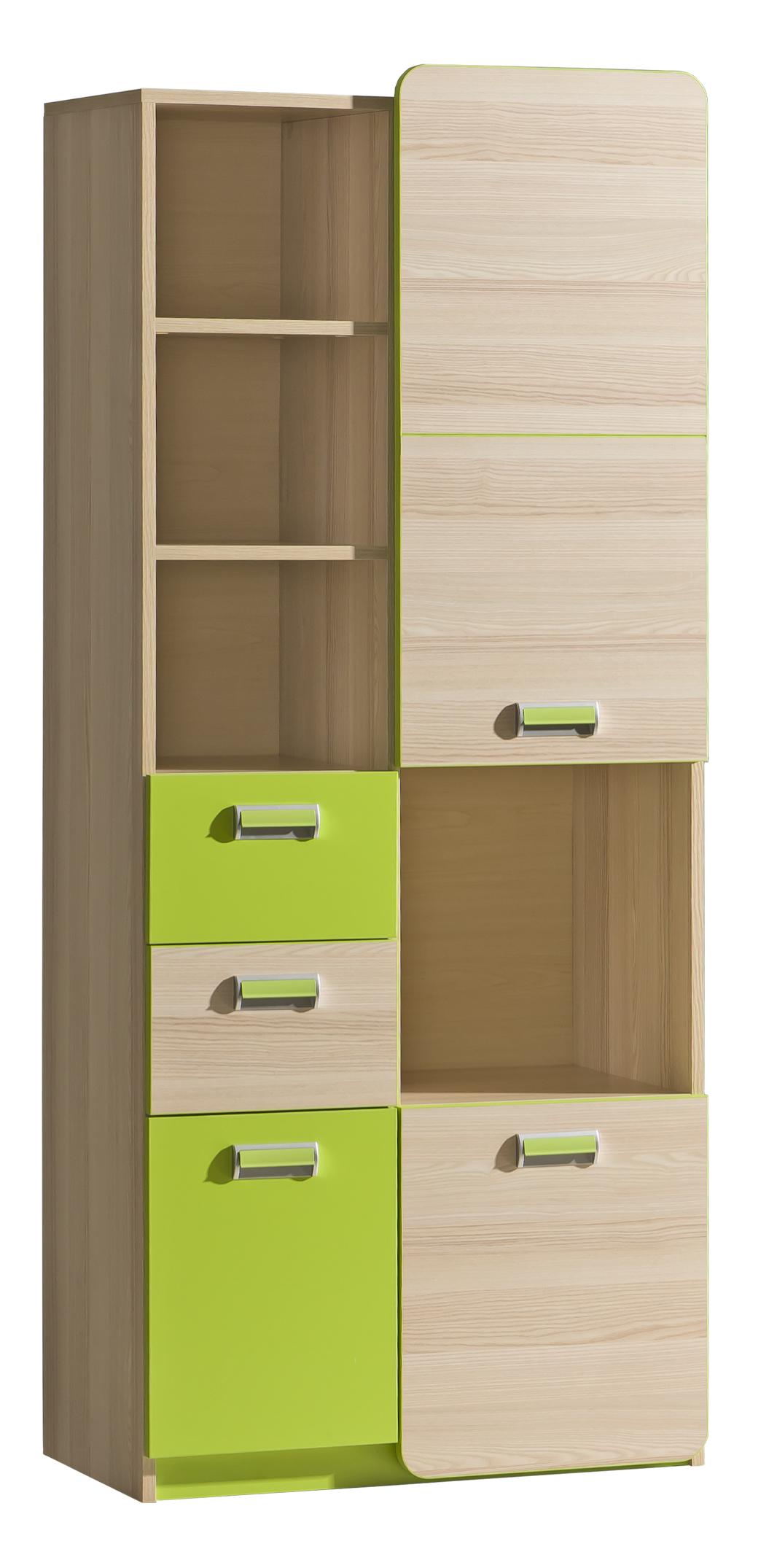 Viši regal modernog dizajna. U lijevom dijelu se nalaze tri otvorene police, dvije ladice i vrata. U desnom dijelu su 2 vrata i otvorena polica u donjem dijelu.