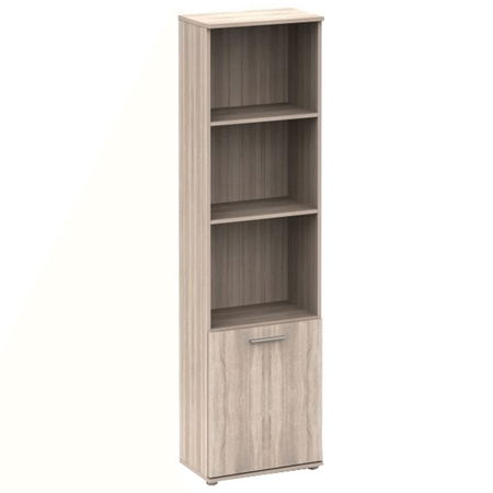Visoki uski regal koji se sastoji od 2 police i jednog ormarića s vratima.