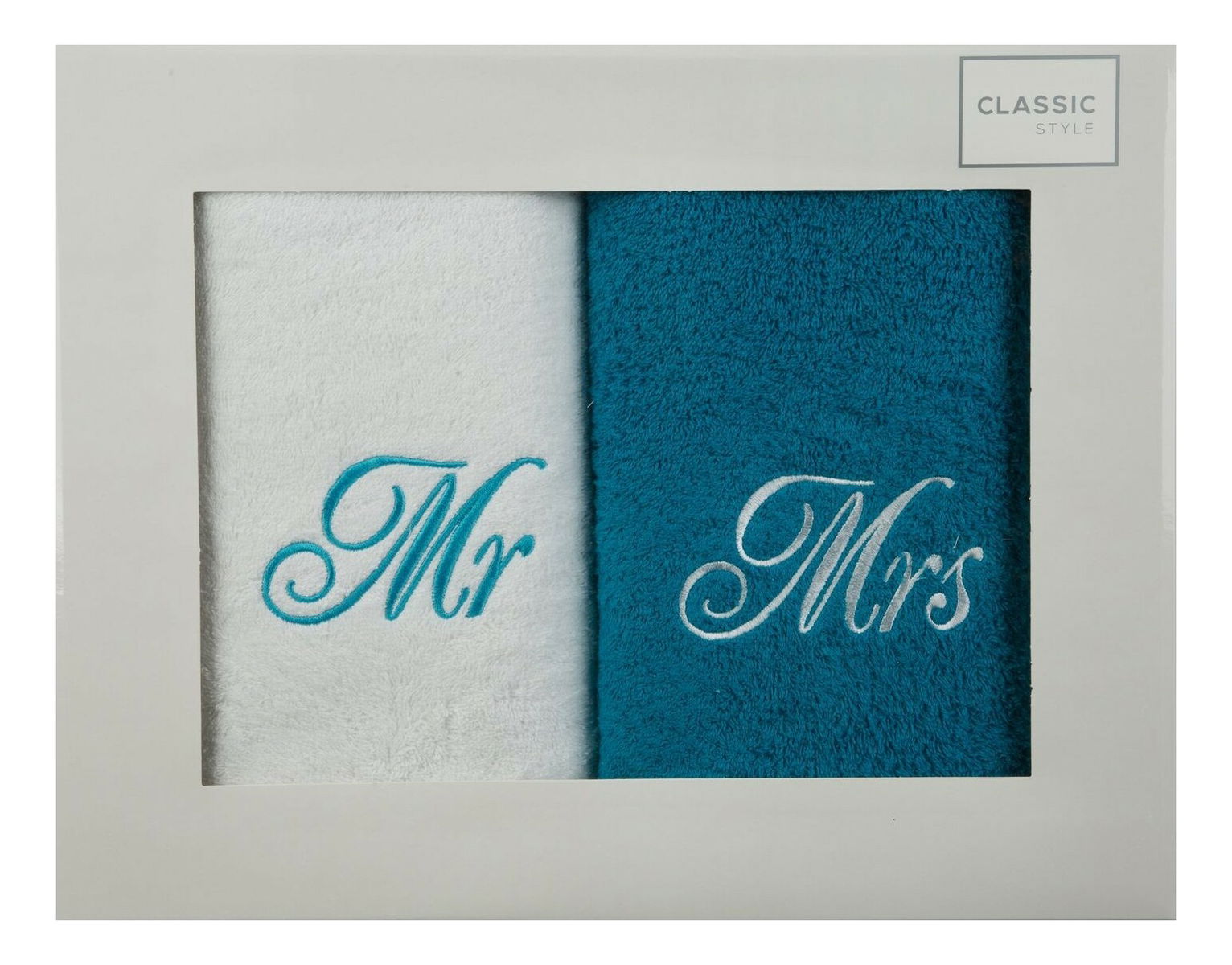 Set ručnika 50x90 cm Mr Mrs (bijela + tirkizna)
