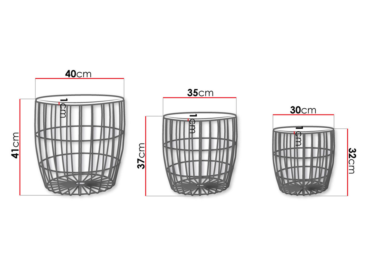 Set od 3 stolića za kavu idealan je izbor za one koji traže udobnost i stil. Dimenzije: Stolić I: promjer: 40 cm, visina: 41 cm, Stolić II: promjer: 35 cm, visina: 37 cm, Stolić III: promjer: 30 cm, visina: 41 cm. Izvedba: okvir: lakirani metal u crnoj ili bijeloj boji, ploča stola: MDF ploča 10 mm, nije potrebna montaža, cijena je za 3 stola. Jamstvo: 24 mjeseca.