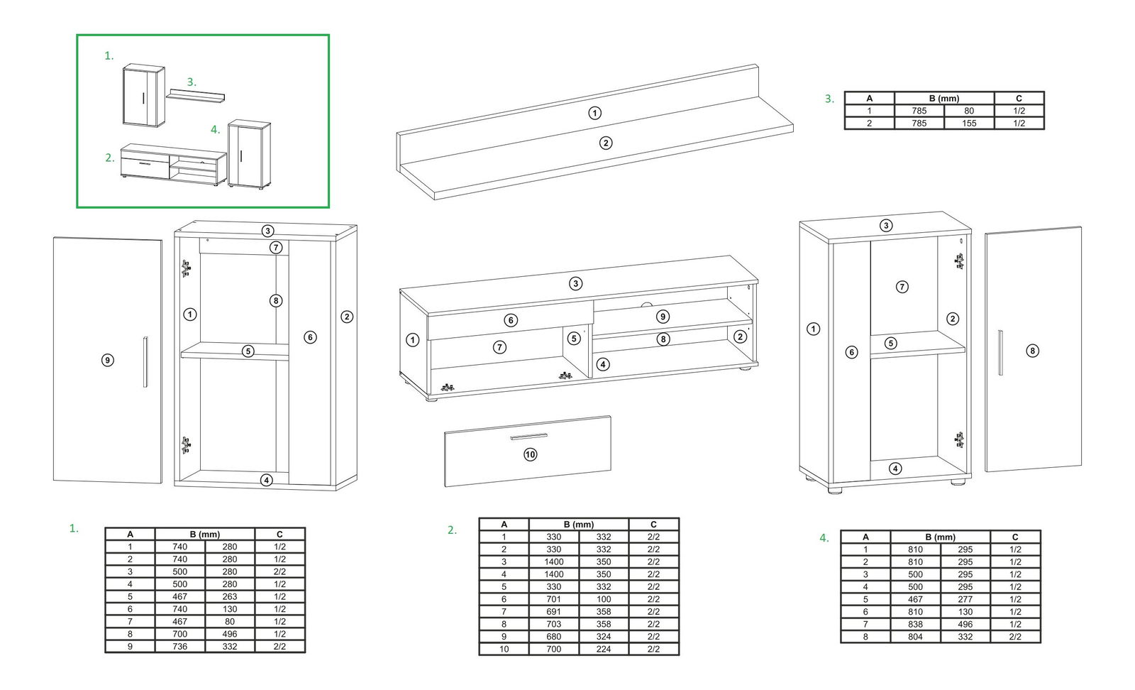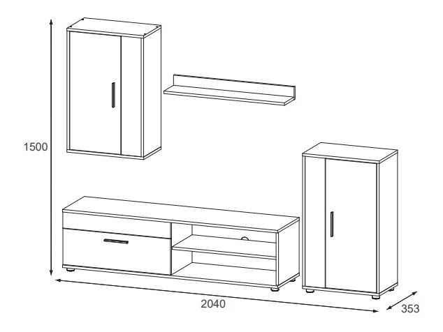 Set za dnevni boravak iz serije Bethsastoji se od police, TV ormarića, viseće i klasične komode.