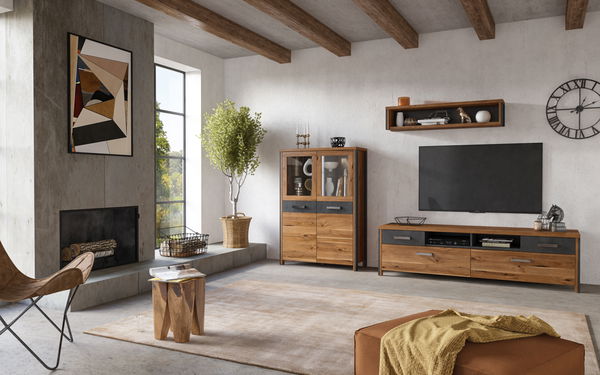 Set za dnevni boravak iz serije Buena se sastoji od sljedećih komponenti: 1x polica Tip 01, 1x TV stolić Tip 40, 1x vitrina Tip 42. Pojedinačne elemente možete postaviti prema svom ukusu i prostornim mogućnostima ili se inspirirati rasporedom na fotografiji. Nudimo LED rasvjetu za kupnju.