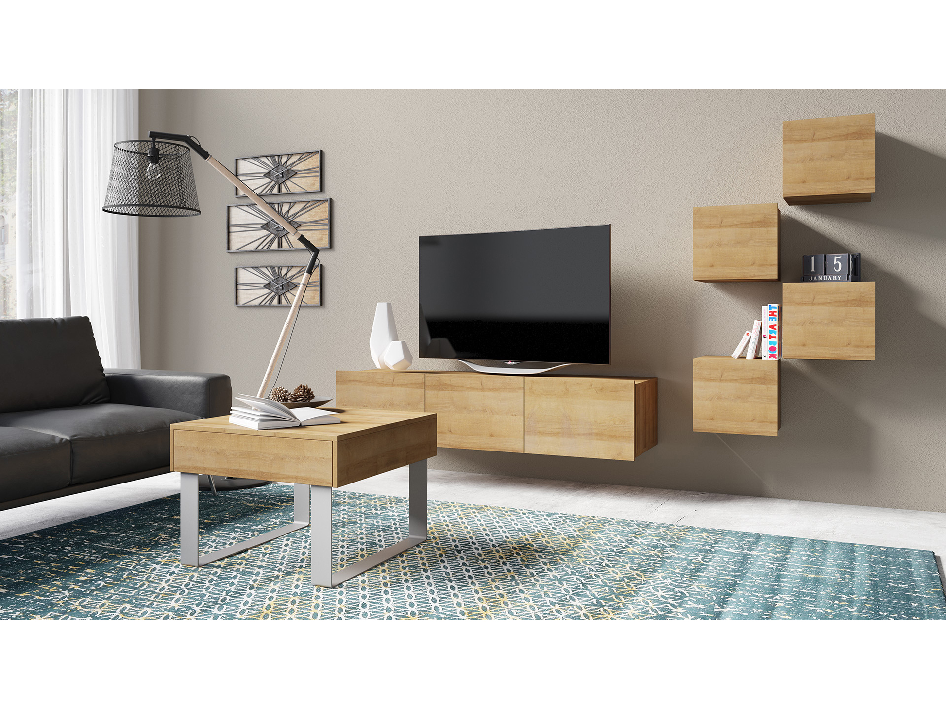 Set za dnevni boravak sastoji se od 6 elemenata: 1x TV stolić RTV 150, 4x zidni ormarić KWADRAT a 1x stolić za kavu MS.