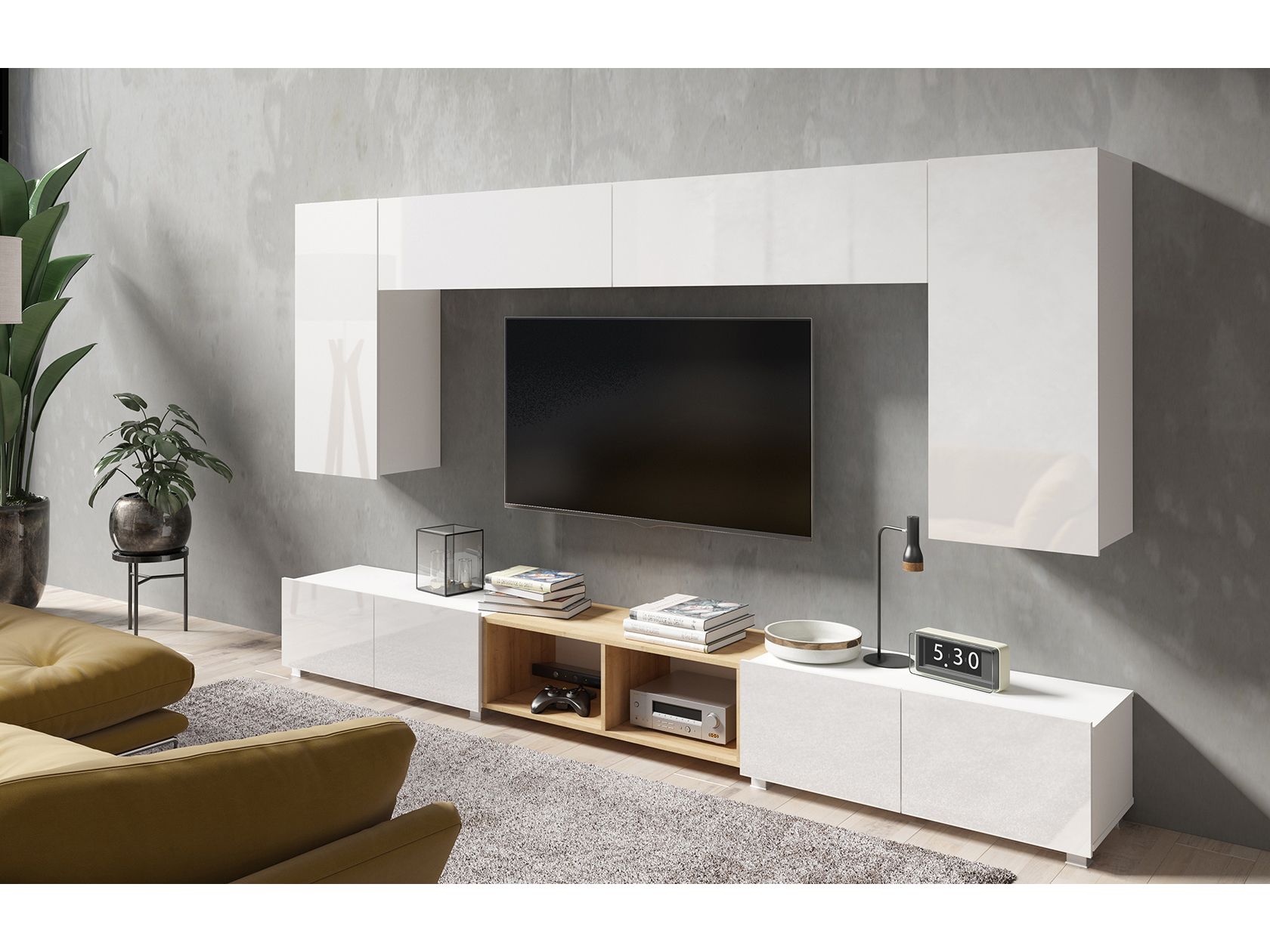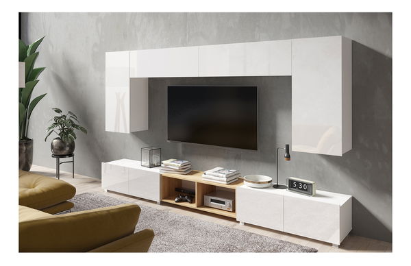 Set za dnevni boravak sastoji se od 7 elemenata: 2x polica, 2x TV stolić RTV100, 2x zidni ormarić 1x viseća polica P100.