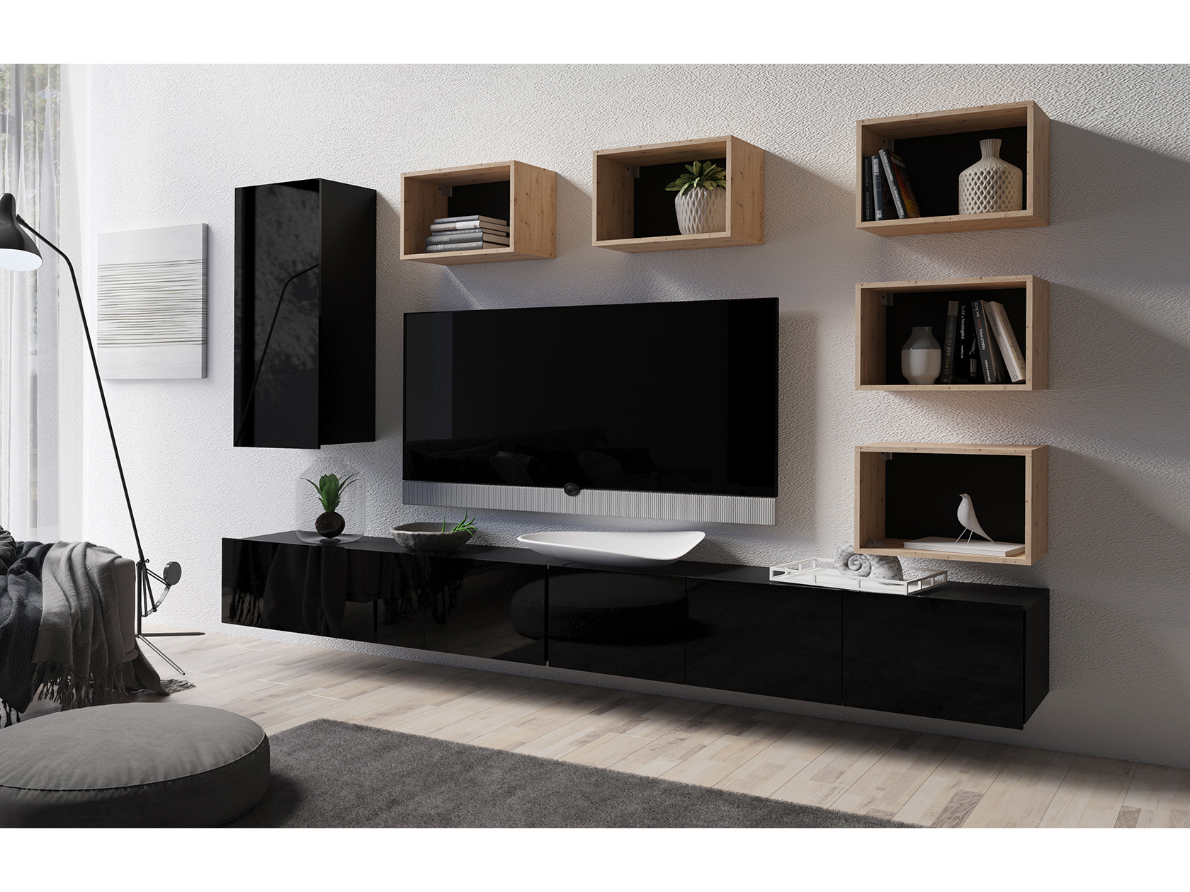 Set za dnevni boravak sastoji se od 8 elemenata: 2x TV stolić RTV 150, 1x zidni ormarić PION a 5x viseća polica P50.