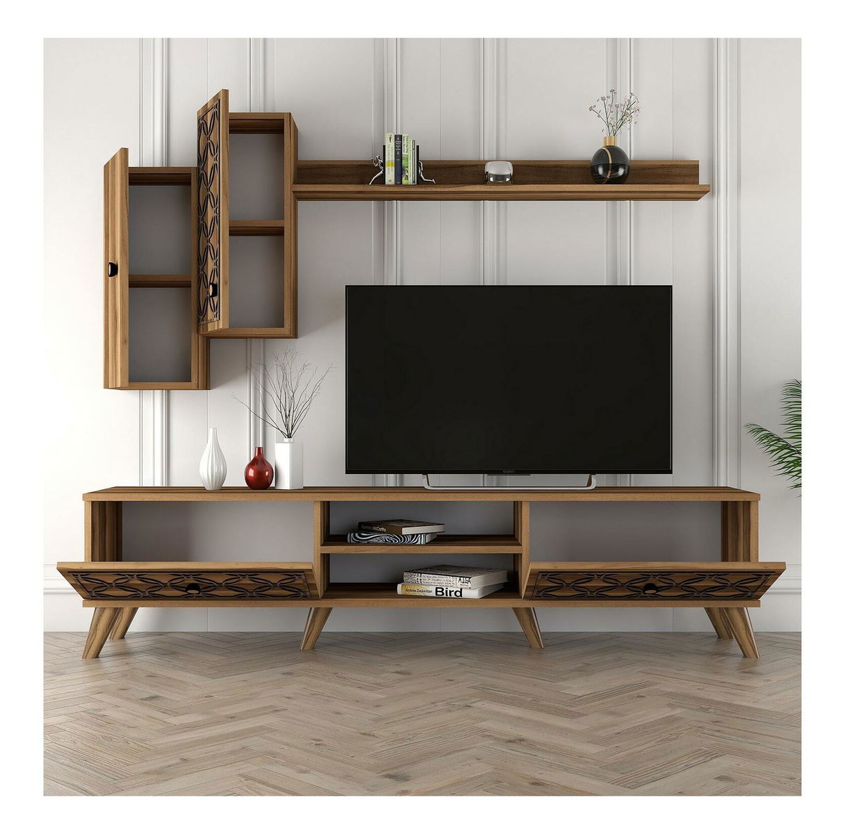 debljina: 18 mm, 4 mm, cnc reljefne plastične noge, dimenzije TV stolića: širina: 180 cm, visina: 44 cm, dubina: 35 cm, dimenzije zidne police: širina: 120 cm, visina: 11,8 cm, dubina: 16,1 cm, dimenzije ormarića: širina: 26,5 cm, visina: 63 cm, dubina: 21,8 cm