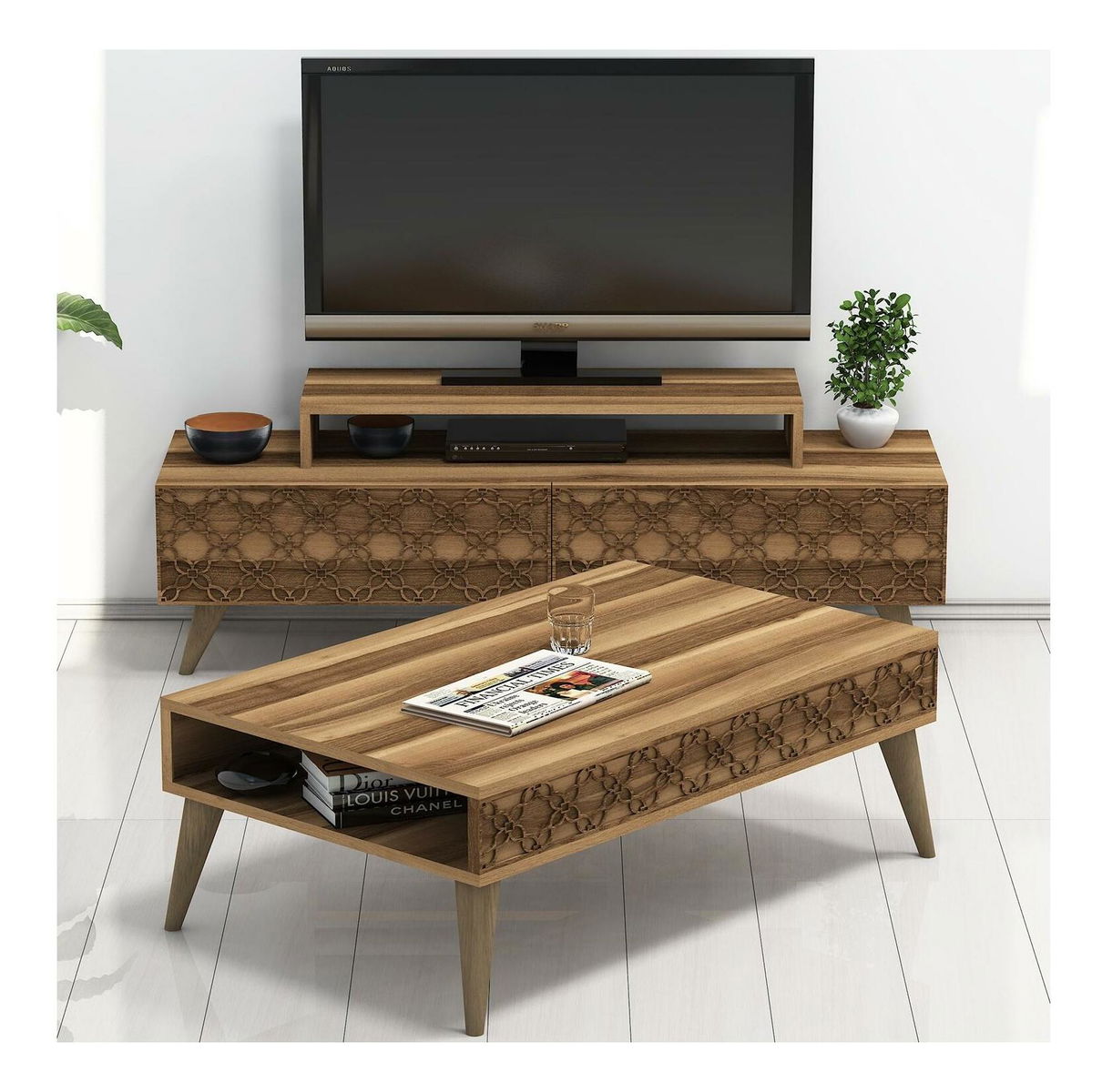 debljina: 18 mm, 4 mm, cnc reljefne plastične noge, dimenzije TV stolića: širina: 140 cm, visina: 48,8 cm, dubina: 41,8 cm, dimenzije stolića za kavu: širina: 105 cm, visina: 36,6 cm, dubina: 60 cm