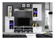 Dizajnerski set za dnevni boravak Frontal 1 bijele boje i vitrinama s plavo-ljubičastom LED rasvjetom.