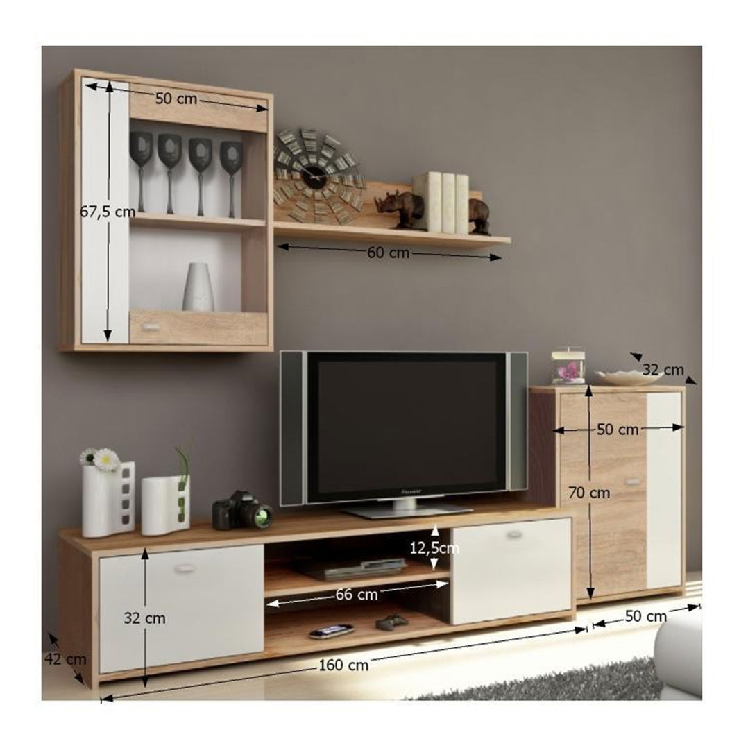 Set se sastoji od TV stolića, komode, visećeg ormarića i police. Komoda je podijeljena na dva prostora za odlaganje. Set za dnevni boravak je izrađen od kvalitetne laminirane iverice i ima ABS rubove.