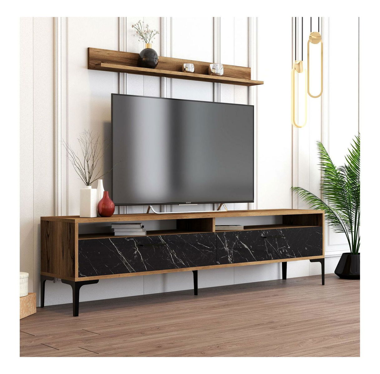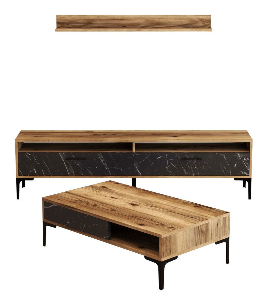 debljina: 18 mm, TV stolić: širina: 180 cm, visina: 47 cm, dubina: 35 cm, veličina zidne police: širina: 120 cm, visina: 11,8 cm, dubina: 16 cm, stolić za kavu: širina: 105 cm, visina: 32,6 cm, dubina: 60 cm, metalne noge,: 17 cm