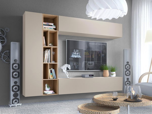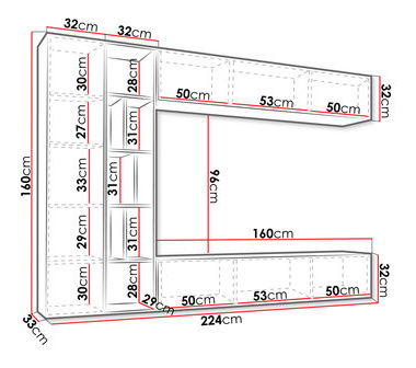 Set za dnevni boravak idealan je izbor za one koji traže udobnost i stil. Dnevni set Leronia odlikuje se jednostavnim oblikom i klasičnim bojama. Idealan je za moderne interijere, ali dobro funkcionira i u tradicionalnijem stilu. Funkcionalan i praktičan. Set uključuje: zidni ormarić s frontom koja prelazi korpus i plinskim podizačem, TV stolić/ormarić sa samokočionim podizačem i dvije police – otvorenu i zatvorenu sustavom "PUSH TO OPEN". Cijeli set izrađen je od laminirane ploče. Ovaj model izvrsna je opcija za razne interijere. Zidni set za dnevni boravak namijenjen je ljubiteljima reda i organizacije. U njega možete spremiti mnoštvo stvari i održavati pod dasku čistom. Dimenzije elemenata seta: Zidni ormarić: širina: 160 cm, visina: 32 cm, dubina: 33 cm. TV stolić/ormarić: širina: 160 cm, visina: 32 cm, dubina: 33 cm. Zatvorena polica: širina: 32 cm, visina: 160 cm, dubina: 33 cm. Otvorena polica: širina: 32 cm, visina: 160 cm, dubina: 29 cm. Dimenzije kompleta: širina: 224 cm, visina: 160 cm, dubina: 33 cm. Izvedba: laminirana ploča debljine 16 mm, papirnati rubovi, skrivene šarke fi 35 mm, sustav otvaranja: zatvorena polica – "PUSH TO OPEN", TV stolić/ormarić – prednja strana prelazi korpus + samokočioni podizač, zidni ormarić – prednja strana prelazi korpus. Jamstvo: 24 mjeseca.