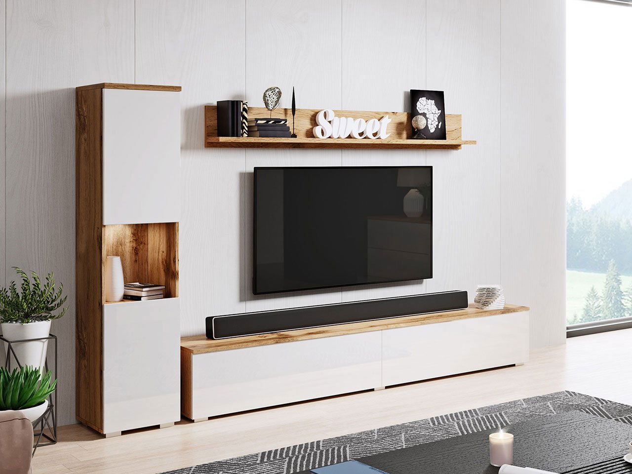 Set za dnevni boravak Nova BR (hrast wotan + bijeli sjaj) (bijela LED rasvjeta)