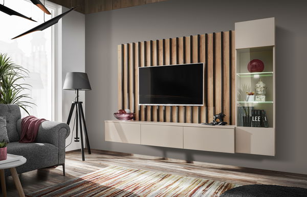 PrikazStvorite moderan i promišljeno organiziran prostor uz ovaj set za dnevni boravak koji se sastoji od TV stolića/ormarića, viseće vitrine i zidnog panela. TV ormarić ima preklopna vrata iza kojih se nalaze 3 odvojene komore – idealne za pohranu tehnike, daljinskih upravljača ili dodataka. Viseći ormarić impresionira djelomično ostakljenom prednjom stranom, iza koje se nalaze klasične police i staklene police s elegantnim bijelim LED osvjetljenjem – savršeno mjesto za izlaganje dekoracija ili čaša. Cjelokupni set upotpunjuje zidna ploča s modernim crnim trakama koja stvara vizualnu ravnotežu i daje prostoru stilski i jedinstven karakter. Ovaj set je idealan izbor za sve koji traže kombinaciju dizajna, funkcionalnosti i ugodne atmosfere.