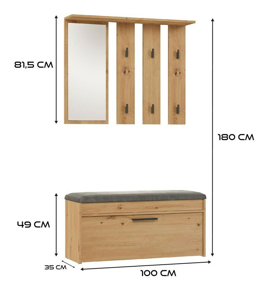 PrikazSet za predsoblje Puntuable 1 u elegantnoj boji hrasta artisan idealno je rješenje za svaki dom koji cijeni stilsko i funkcionalno uređenje. Ovaj moderan komad namještaja kombinira praktične elemente poput šest crnih vješalica za odjeću, ogledala i ormarića s prostorom za obuću i sjedenjem, čime omogućuje udobnu i preglednu organizaciju. Izrađen od kvalitetne laminirane iverice, ovaj set je izdržljiv i jednostavan za održavanje, što ga čini odličnim izborom za sve koji cijene estetiku i funkcionalnost.