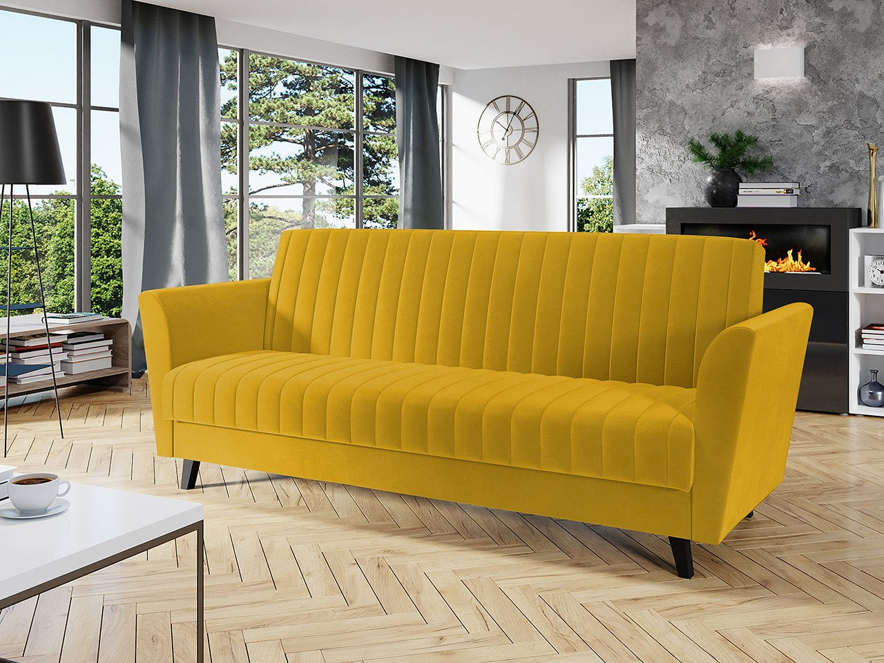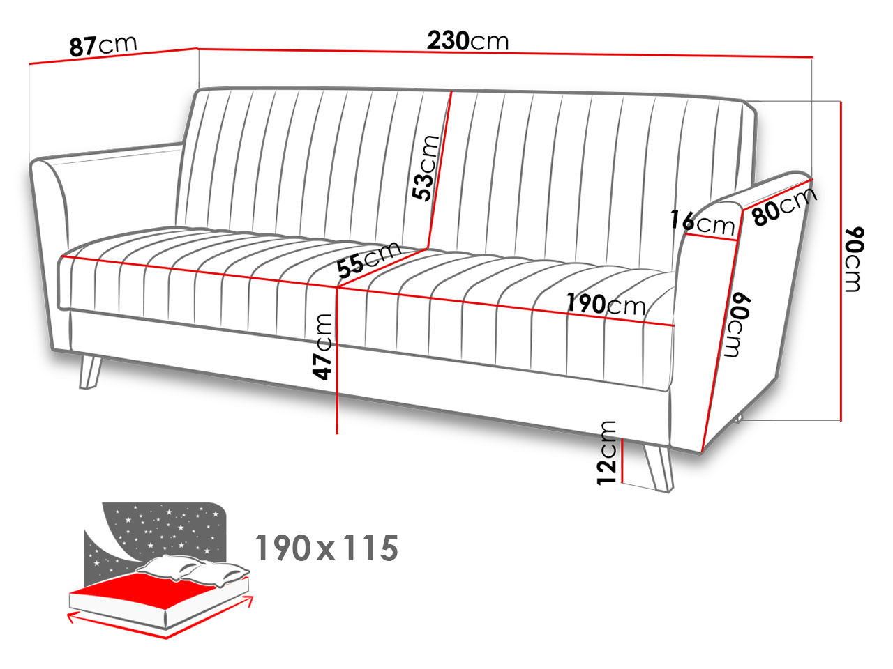 Sofa je idealan izbor za one koji traže udobnost i stil. Udobna, ali stilska sofa Burberry učinkovito će ukrasiti interijer dnevnog boravka koji često posjećuju gosti. Njezin izuzetan, elegantan izgled temelji se na klasičnom stilu, koji je kombiniran s modernom paletom boja presvlaka. Čar sofe dodatno naglašava simetrično prošivanje sjedala i naslona. S aspekta funkcionalnosti, rasklopiva sofa opremljena je funkcijom spavanja i prostranim spremnikom za posteljinu. Svakodnevno rasklapanje sofe olakšava ugrađeni stroj CLIC-CLAC. Dimenzije: duljina: 230 cm, širina: 87 cm, visina: 90 cm, površina za spavanje: 190 x 115 cm. Izvedba: okvir: borovo drvo + iverica + MDF, sjedalo: T25/42 pjena + opružna opruga, naslon: T25/42 pjena + opružna opruga, rasklopiva sofa ima funkciju spavanja, spremnik za posteljinu, automatski sklopivi stroj CLIC-CLAC, noge: crne drvene, tapecirani naslon fiksno pričvršćen, sofa nije slobodnostojeća (stražnja strana nije tapecirana tkaninom). Dimenzije spremnika: duljina: 167 cm, širina: 73 cm, visina: 18 cm. Jamstvo: 24 mjeseca.