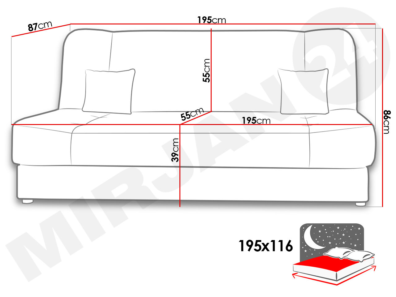 Sofa na razvlačenje idealan je izbor za one koji traže udobnost i stil. Želite li još više uživati u popodnevnom ili večernjem odmoru? Opremajte svoju zonu za opuštanje sofom na razvlačenje Mario Style. Ako vam se počnu sklapati oči uz televiziju, dovoljno ju je razvući, iz prostora za pohranu izvaditi posteljinu i mirno uroniti u carstvo snova. Dimenzije: duljina: 200 cm širina: 87 cm visina: 86 cm ležajna površina: 195x116 cm Boja: odaberite boju ovdje Dodatne informacije: prostor za pohranu: da na razvlačenje: da potpuno tapecirano (podstavnom tkaninom Wigofil i na stražnjoj strani) 2 mala jastuka s patentnim zatvaračem uključena drveni okvir letvi + DTD ploča valovite opruge visokoelastična pjena nogice: PVC (crne) Jamstveno razdoblje: 24 mjeseca.