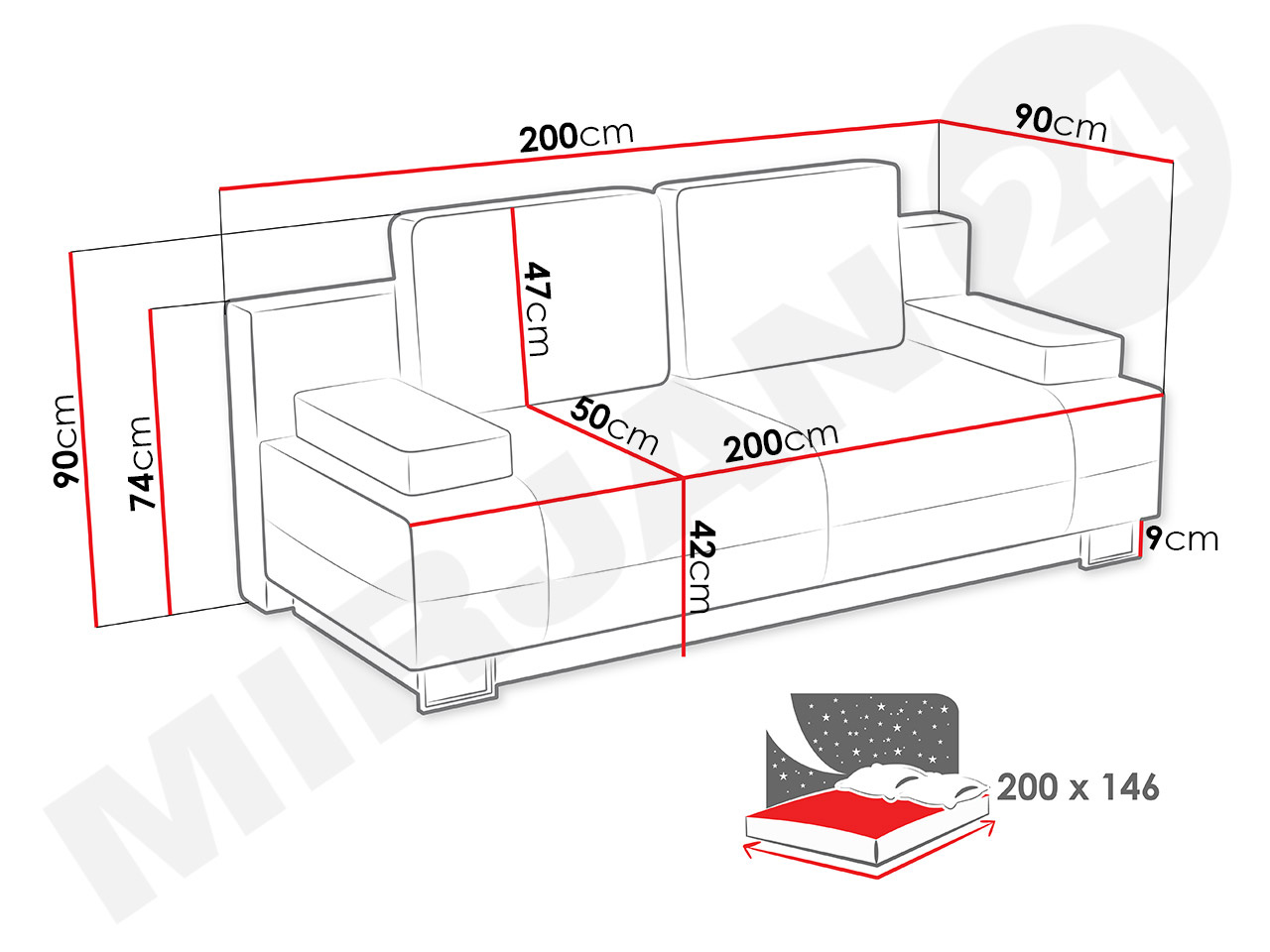 Sofa je idealan izbor za one koji traže udobnost i stil. Sofa Mulan impresivno će ukrasiti moderan interijer. Sofa s funkcijom svakodnevnog spavanja opremljena je spremištem za posteljinu i automatom za jednostavno rasklapanje. Zahvaljujući upotrebi visoko fleksibilne pjene, ovaj komad namještaja pruža osjećaj udobnosti, opuštanja i odmora tijekom obiteljskog odmora, ali i za zajednička druženja s prijateljima. Sofa je izrađena s posebnom pažnjom na detalje – čak je i stražnji dio slobodnostojeće sofe presvučen tkaninom, tako da je možete slobodno smjestiti u prostoriji. Dimenzije: duljina: 200 cm, širina: 90 cm, visina: 90 cm, površina za spavanje: 200 x 146 cm. Materijal: okvir: borovo drvo + iverica, sjedalo: pjena T25/42 + valovita opruga tip b, naslon: visoko elastična pjena T25/42 + opružna letva, rasklopiva sofa s funkcijom spavanja, spremište za posteljinu, noge: metalne, naslon u obliku pomičnih jastuka, jastuci u kompletu s patentnim zatvaračem, slobodnostojeća sofa (presvučena tkaninom). Dimenzije spremišta: duljina: 185 cm, širina: 61 cm, visina: 24 cm. Jamstvo: 24 mjeseca.