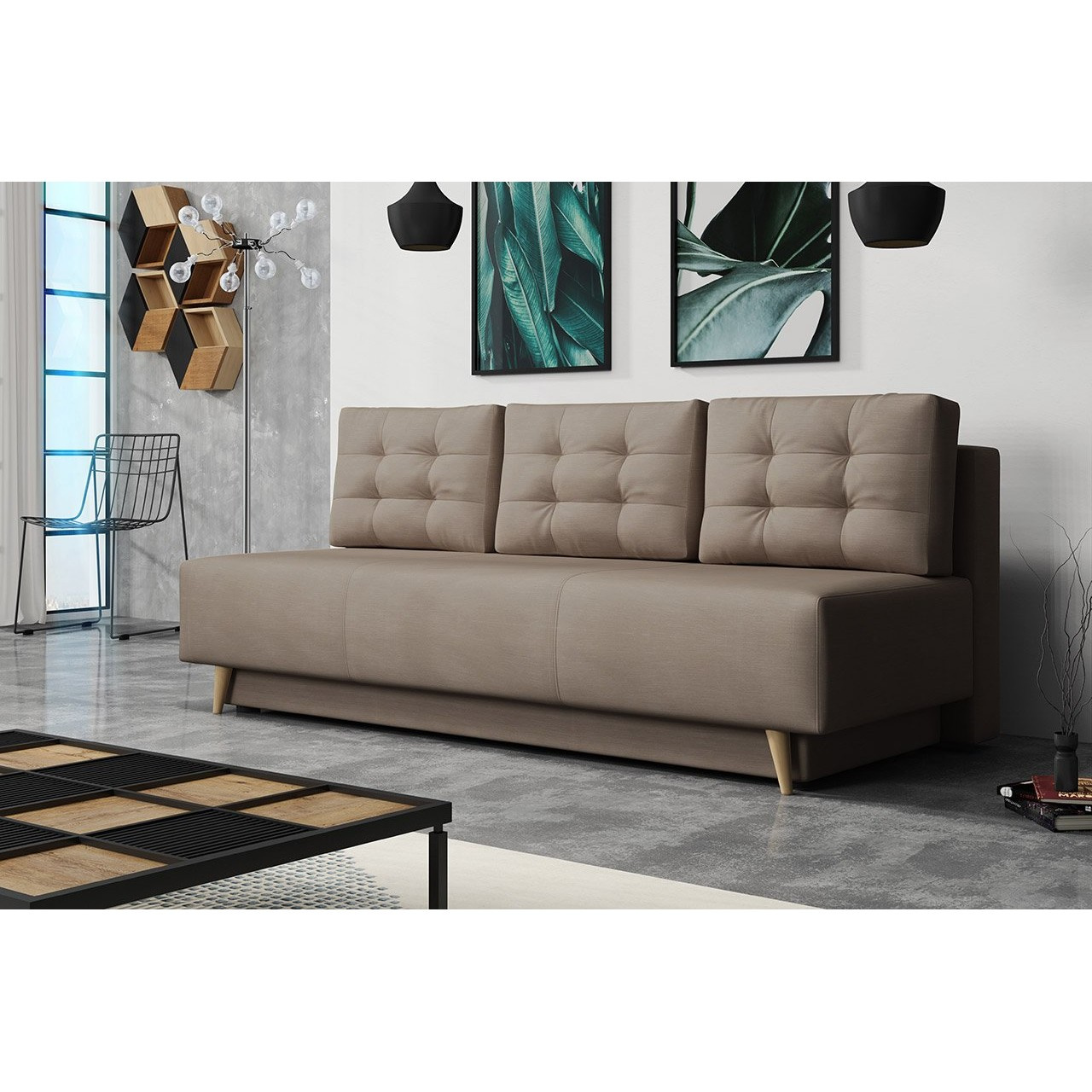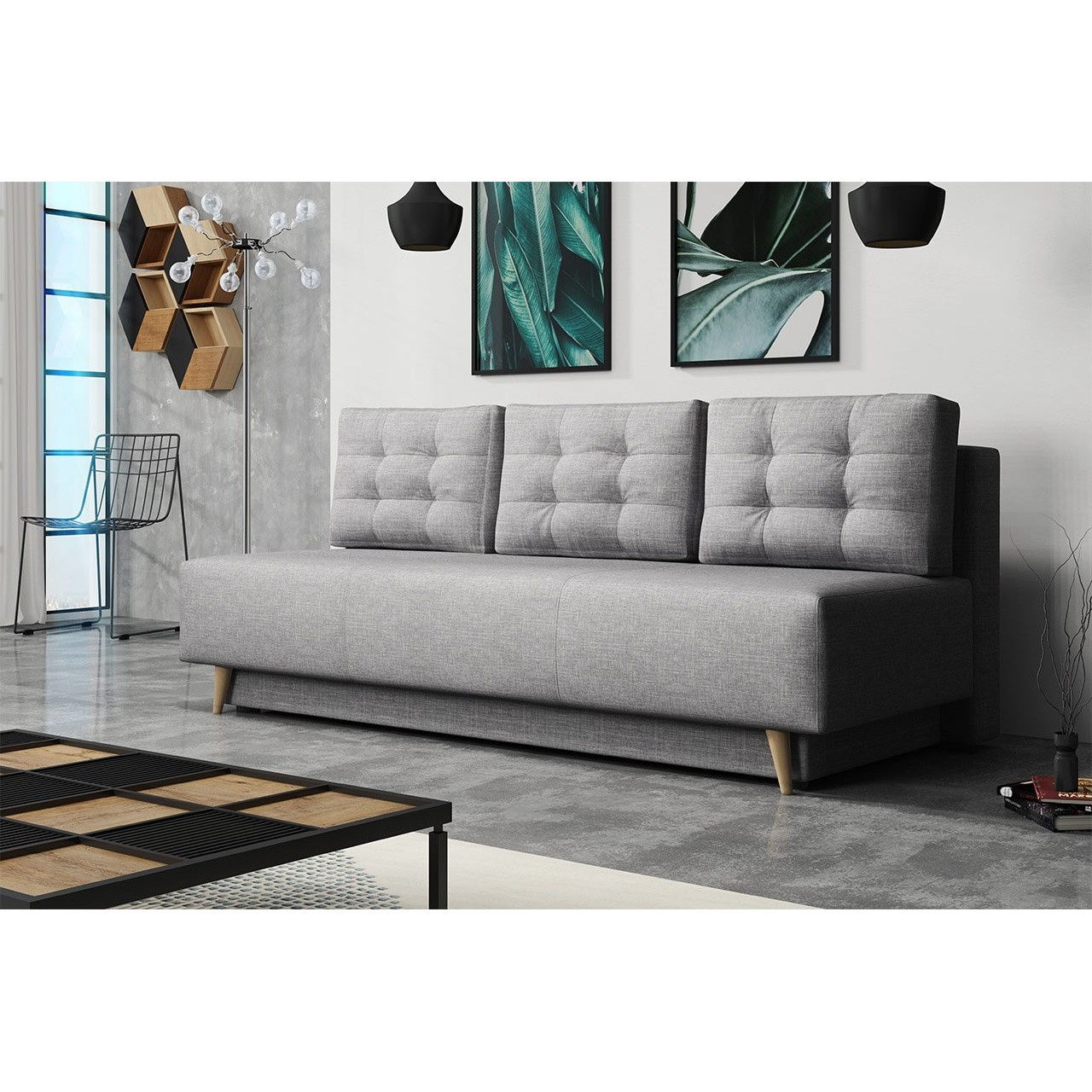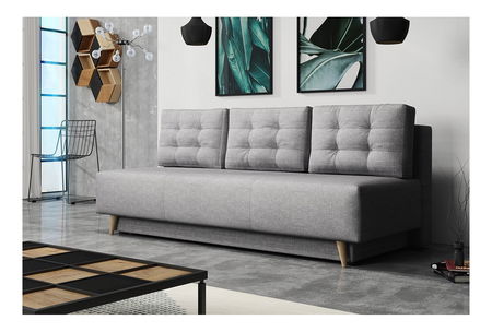 Sofa je idealan izbor za one koji traže udobnost i stil. Sofa Mundo je komad bezvremenskog karaktera. Savršeno se uklapa i u skandinavske i u modernije interijere. Ima udobnu funkciju spavanja i prostor za pohranu posteljine. Sofa Mundo izrađena je od izdržljivih materijala, što jamči dugogodišnje zadovoljstvo pri korištenju. Sofa Mundo prikladna je ne samo za prostrane dnevne boravke, već i za manje dnevne ili omladinske sobe. dimenzije: duljina: 200 cm, širina: 87 cm, visina: 90 cm, površina za spavanje: 200 x 142 cm izvedba: okvir: borovo drvo + iverica, sjedalo: T25 / 42 pjena + opruga Bonell, naslon: T25 / 42 pjena + opruga Bonell, rasklopiva sofa ima funkciju razvlačenja, spremište za posteljinu, način razvlačenja - tip "delfin", noge: drvene, naslon u obliku podesivih jastuka s patentnim zatvaračem, sofa je samostojeća (presvučena tkaninom) Dimenzije spremišta: - duljina: 185 cm, - širina: 61 cm, - visina: 24 cm Jamstvo: 24 mjeseca.
