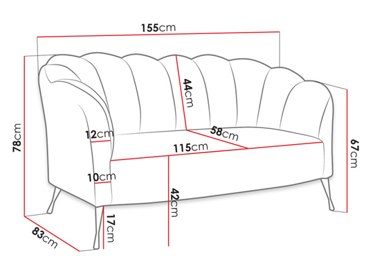 Sofa u glamour stilu je idealan izbor za one koji traže udobnost i stil. Sofa u glamour stilu Terkaz stilski krasi prostor dnevnog boravka. Visoke noge, mekano tapecirano sjedalo i prošiveni naslon u obliku školjke prednosti su koje privlače poglede, a što je još važnije, uljepšavaju i vrijeme provedeno u opuštanju u dnevnom boravku. Čitanje knjige, ispijanje kave i gledanje nove sezone vaše omiljene serije – svaka od tih aktivnosti na sofi Terkaz omogućit će vam još više opuštanja. Dvosjed sofa je samostojeća, tako da se može postaviti u bilo koji dio dnevnog boravka. Dimenzije: dužina: 155 cm, širina: 83 cm, visina: 78 cm Izvedba: okvir: 16 mm debela iverica + drveni okvir, sjedalo: HR 3530 pjena + valovita opruga, naslon: T2315 pjena + T25 pjena, metalne noge – boje po izboru, sofa nije na razvlačenje, bez prostora za pohranu, tapecirani naslon fiksno učvršćen, samostojeća sofa (stražnji dio tapeciran tkaninom) Jamstvo: 24 mjeseca.