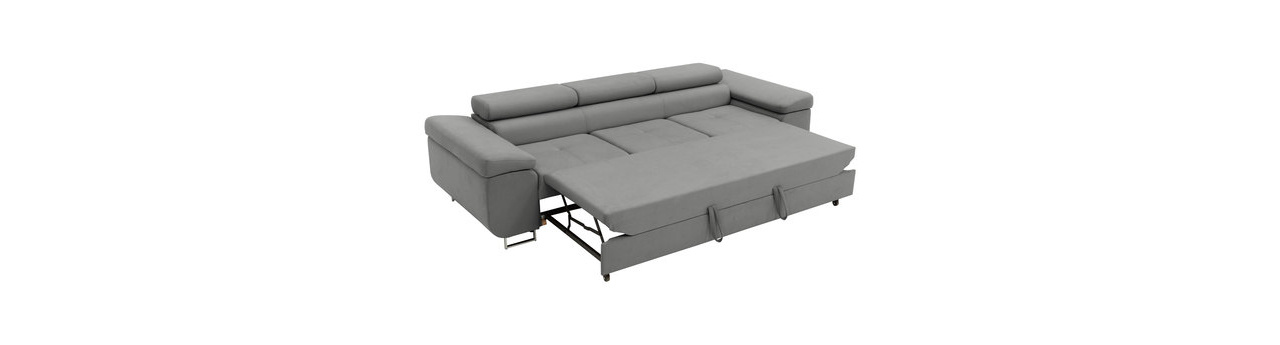 Sofa je idealan izbor za one koji traže udobnost i stil. Sofa na razvlačenje Torezio III Bis pripada obitelji omiljenog tapeciranog namještaja. Ovaj udobni model savršeno se uklapa u mnoge aranžmane. Njegove brojne varijante boja omogućuju savršeno usklađivanje s okolnim dekorom. Za još veći komfor, slobodnostojeća Sofa Torezio III Bis opremljena je podesivim naslonima za glavu. Ovo rješenje omogućuje savršeno prilagođavanje potrebama svakog korisnika. Još jedna prednost predstavljene slobodnostojeće S ofe je automatski mehanizam tipa Delfin koji olakšava njezino razvlačenje. Zahvaljujući tom mehanizmu varijanta sjedenja pretvara se u udobnu površinu za spavanje čak i za dvije osobe. Dimenzije: širina: 263 cm, dubina: 102 cm, visina: 70-90 cm, površina za spavanje: 192 x 124 cm. Izvedba: konstrukcija sjedala: drveni okvir + valovita opruga "tip A" + filc + ispuna + 10 cm debela visokoelastična pjena T 2844, konstrukcija naslona: drveni okvir + 15 mm debela iverica + elastične trake + vatelin + 8 cm debela visokoelastična pjena T 2844, Sofa je na razvlačenje, automatski sklopivi mehanizam delfinskog tipa, ima funkciju spavanja, nema spremnik za posteljinu, podesivi nasloni za glavu, noge: kromirani metal (visina 9 cm) + plastika, trajno pričvršćen tapecirani naslon, funkcija spavanja tapecirana je istim materijalom kao i ostatak namještaja, Sofa je slobodnostojeća (stražnji dio presvučen tkaninom). Jamstvo: 24 mjeseca.